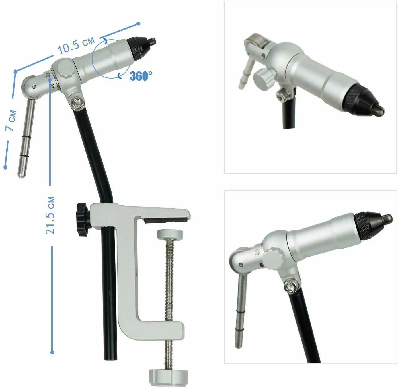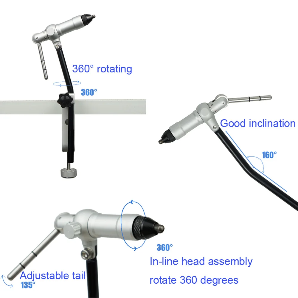 Este es un tornillo de banco de viaje de atado de moscas giratorio de acción de palanca única extremadamente duradero y simple para minimizar el peso mientras se mantiene la resistencia a la tracción y la durabilidad, con mordazas de acero endurecido y templado. El tornillo de Banco viene acompañado de una resistente abrazadera en C para ayudar a anclarla en su lugar. El montaje de la cabeza en línea gira 360 grados, esto permite al nivel ver la mosca desde todos los ángulos, terminar de atar la mosca sin quitar el gancho. Al girar el tornillo, se puede ajustar la altura del tornillo de banco.