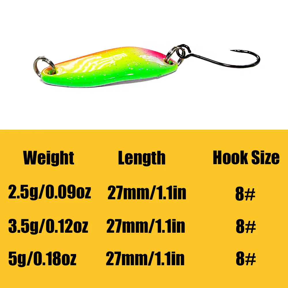 Cucharas de muy alta calidad a un precio muy justo. Los anzuelos son afilados, los colores son muy vibrantes y el efecto UV también es muy bueno. Estoy realmente impresionado.