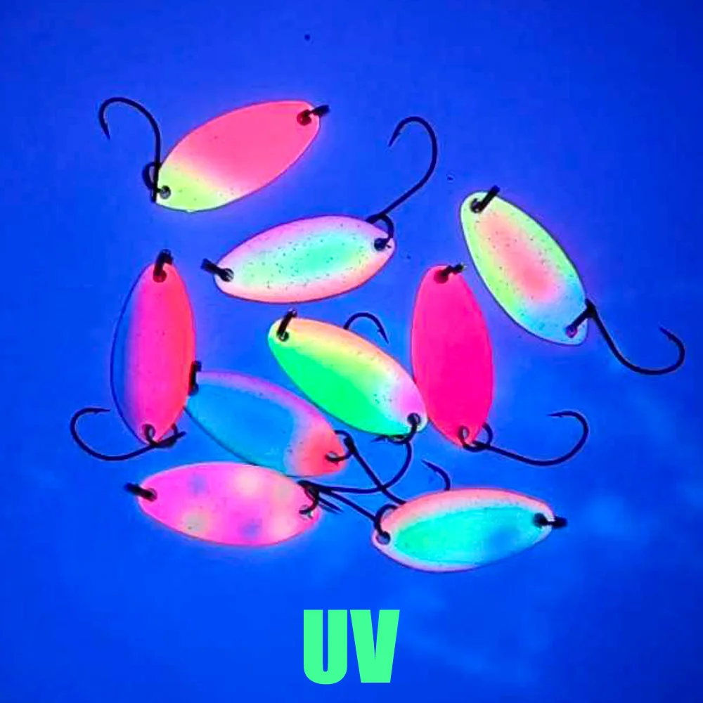 Cucharas de muy alta calidad a un precio muy justo. Los ganchos son afilados, los colores son muy vibrantes, y el efecto UV también es muy bueno. Estoy realmente emocionado.