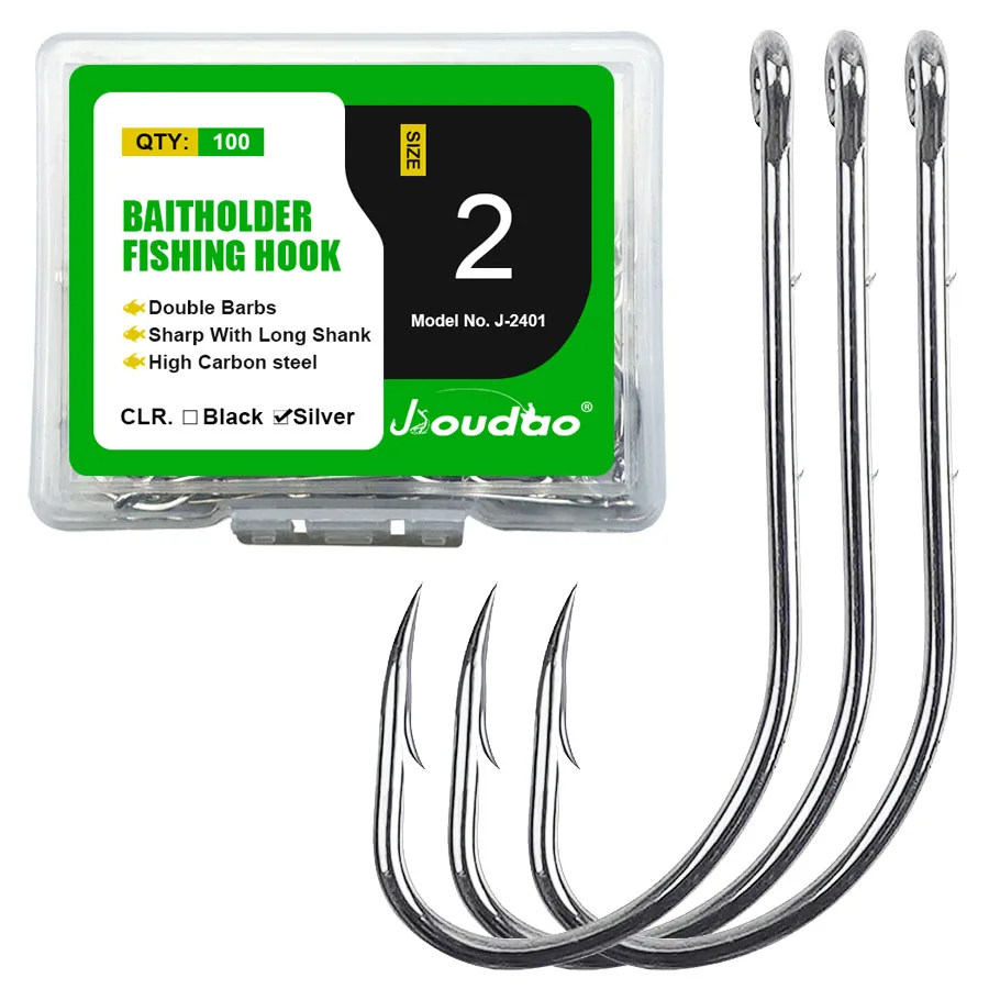 Anzuelos de pesca Baitholder, anzuelos de pesca de vástago largo de 100, anzuelos de cebo de pico de púas con 2 púas, anzuelos de pesca de plantilla de acero al carbono plateado, agua salada y agua dulce