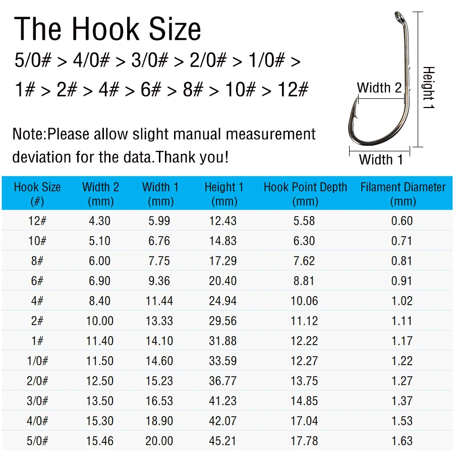 Hook Size: 100Pcs Size 12 , 100Pcs Size 10 , 100Pcs Size 8 , 100Pcs Size 6 , 100Pcs Size 4 , 70Pcs Size 2 , 60Pcs Size 1 , 50Pcs Size 1/0 , 40Pcs Size 2/0 , 25Pcs Size 3/0 , 20Pcs Size 4/0 , 16Pcs Size 5/0