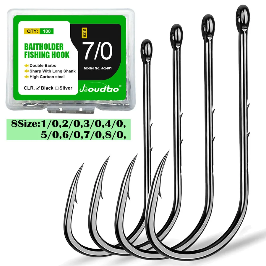 Anzuelos de pesca Baitholder, 100 Uds., anzuelos de pesca de vástago largo, anzuelos de cebo de pico farpado con 2 púas, anzuelos de pesca de plantilla de acero al carbono plateado, agua dulce salada