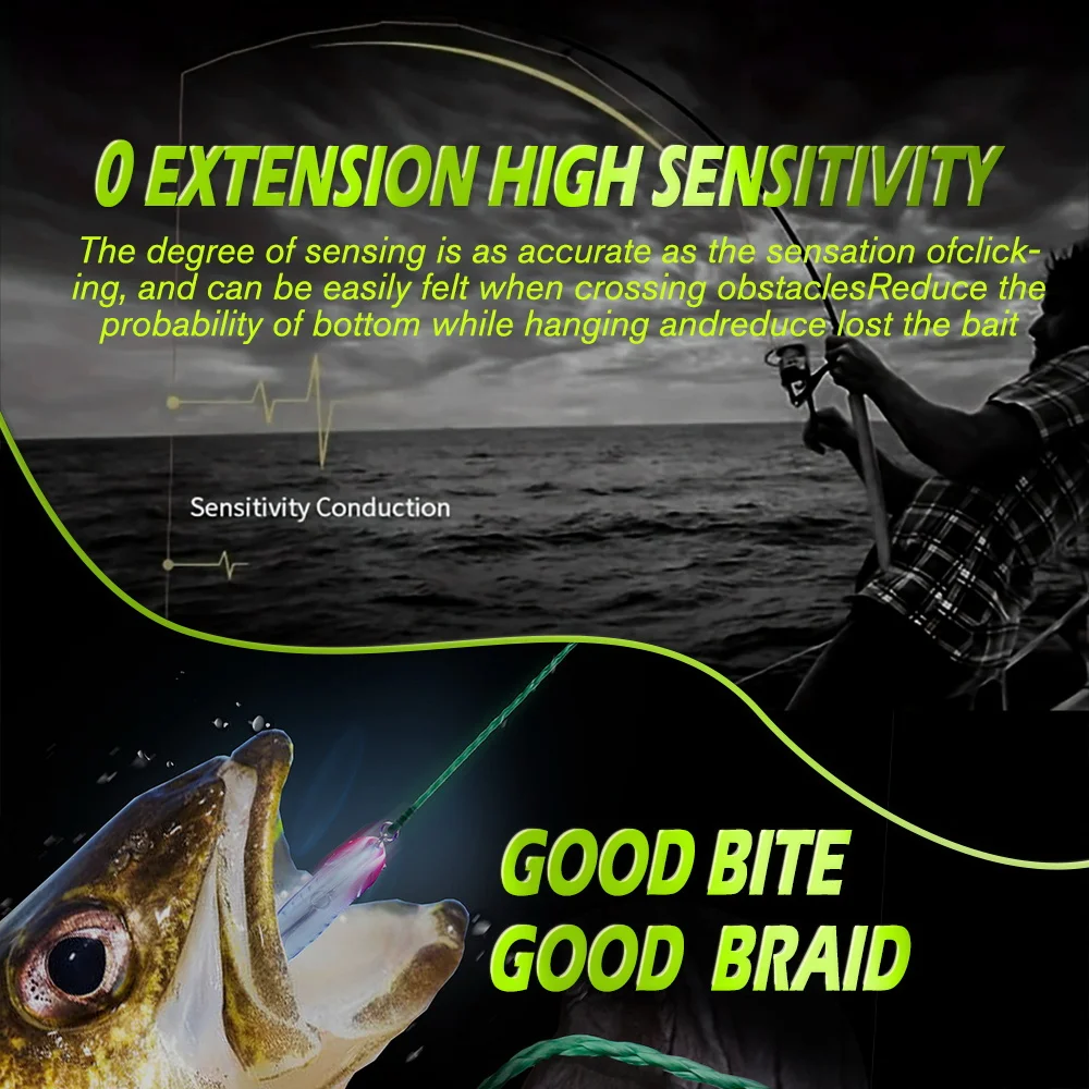 1 Tecnología avanzada de gran angular: la súper línea suave.2 Resistencia del nudo ultra. Solidez del color mejorada.3 Fundición larga y rápida: más suave que nunca.4 Súper sensibilidad: sensación instantánea de estructura y golpes.5 Más resistente al desgaste y más duradero 6 colores de alta visibilidad y baja visibilidad disponibles.