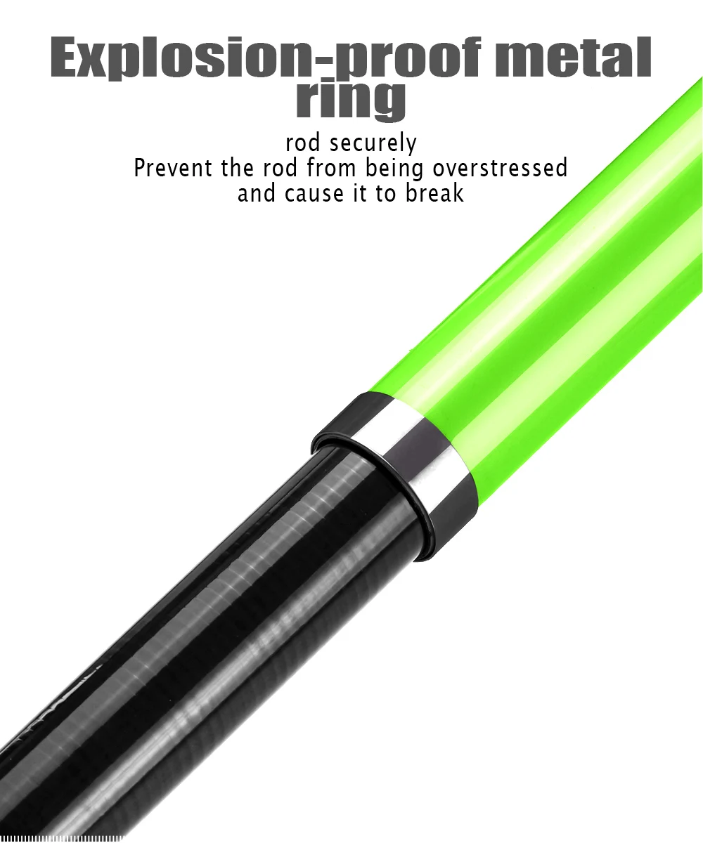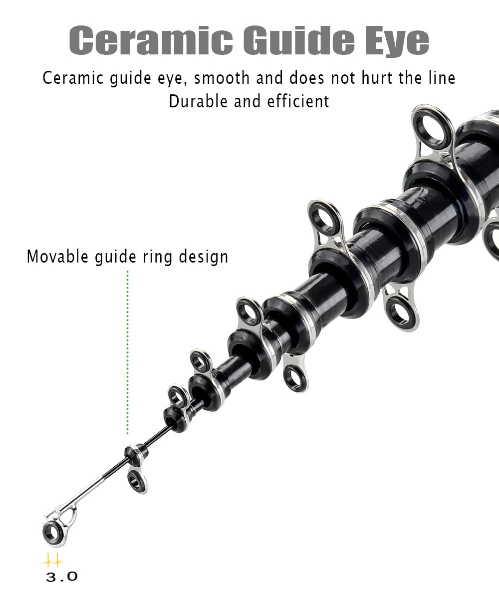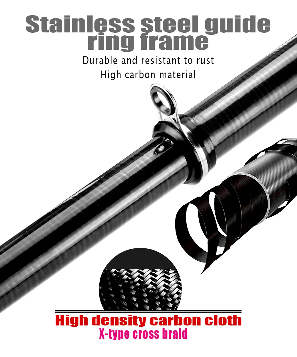 1. de la caña Cuerpo: el cuerpo de la caña de pescar está hecho de tela de carbono de alta densidad, trenzado cruzado tipo X, que es muy ligero y duradero.
