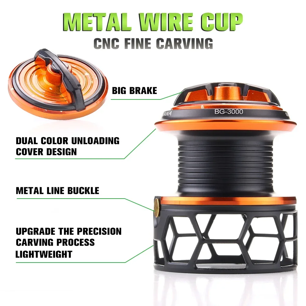 BAKAWA-carrete de pesca giratorio Serie 1000-3000, rueda de anillo de lanzamiento de alambre de Metal, arrastre máximo de 15kg, aparejos para carpa de agua salada y dulce 5,2: 1