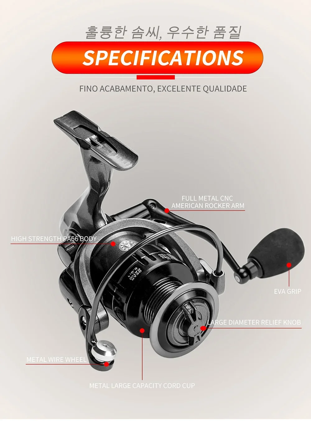 1. Tecnología ligera y potente: el diseño de cuerpo ultrafino y los carretes de metal mecanizados por CNC son ideales para la pesca a largo plazo.