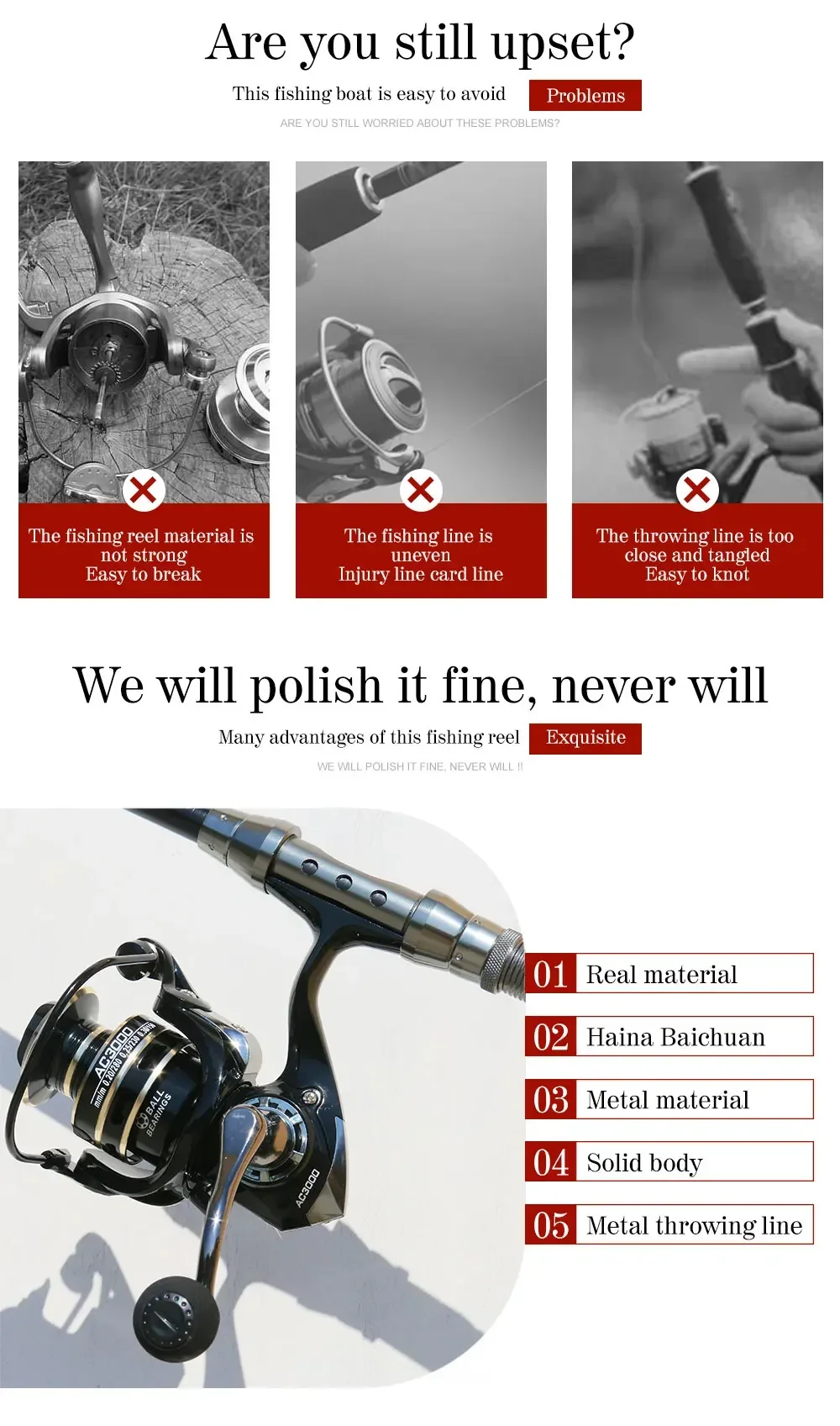 1. Tecnología ligera y potente: el diseño de cuerpo ultrafino y los carretes de metal mecanizados por CNC son ideales para la pesca a largo plazo.