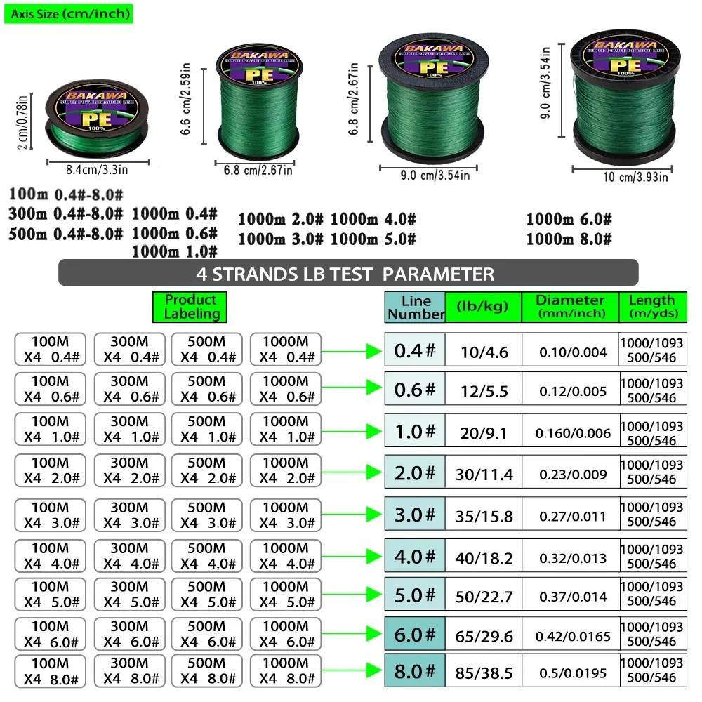 BAKAWA-línea de pesca trenzada de 4 hilos, trenza X4, 6 colores, 300m, 500m, arrastre máximo, 85LB, multifilamento, línea PE japonesa para agua dulce de mar