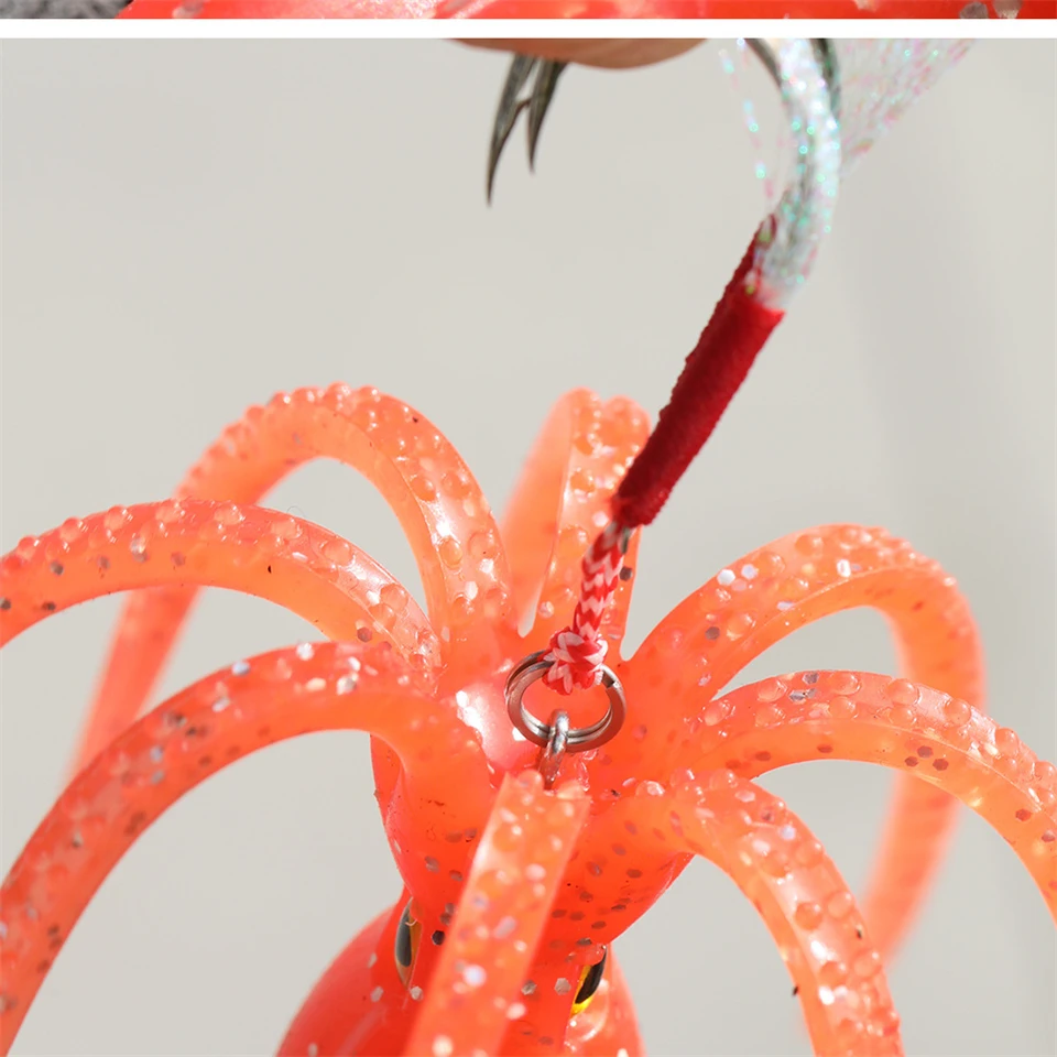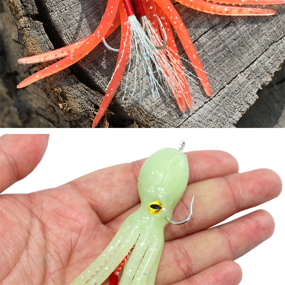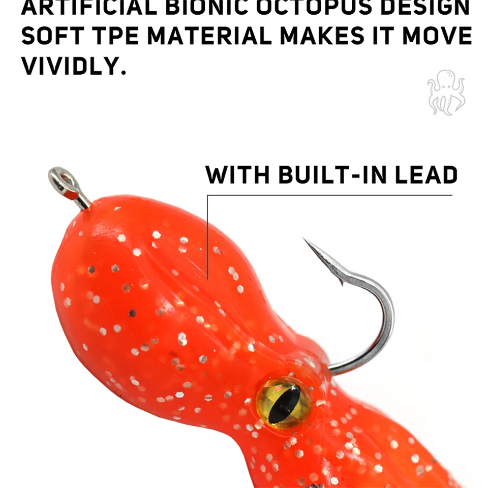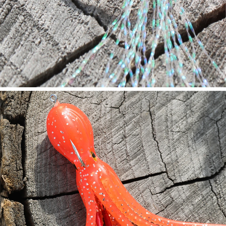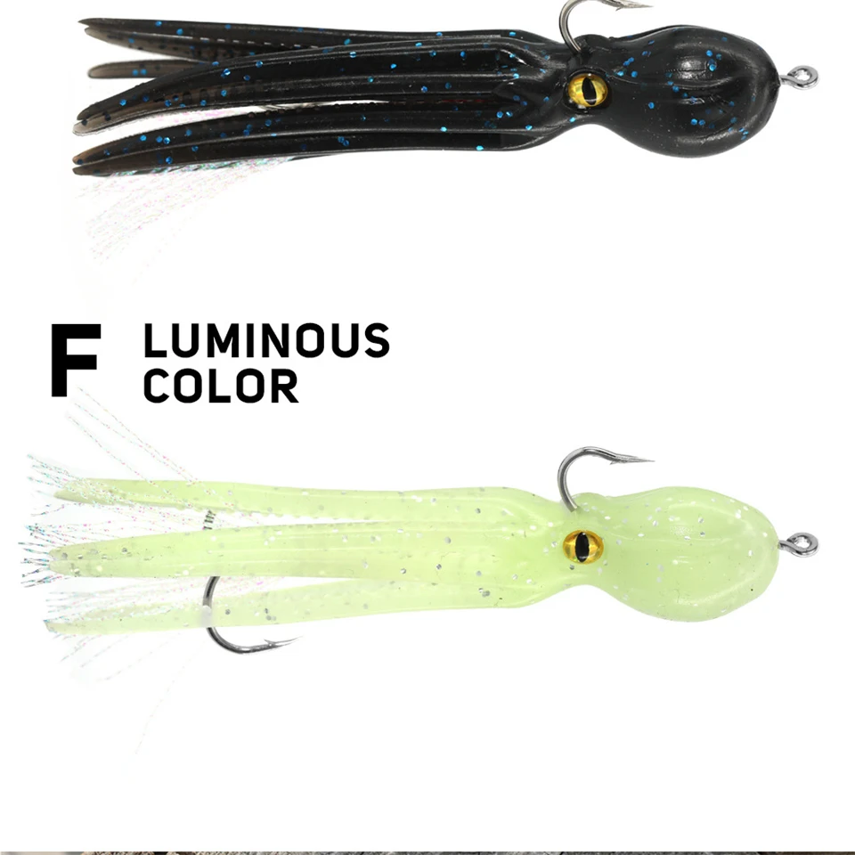 3. Bucles y anzuelos dobles: los anzuelos de púas individuales de alta calidad y los anzuelos triples están conectados a la cabeza para aumentar la tasa de captura de su pez objetivo. El lazo adicional en la parte superior del cebo de pulpo se puede conectar a otro gancho con una cabeza a presión.