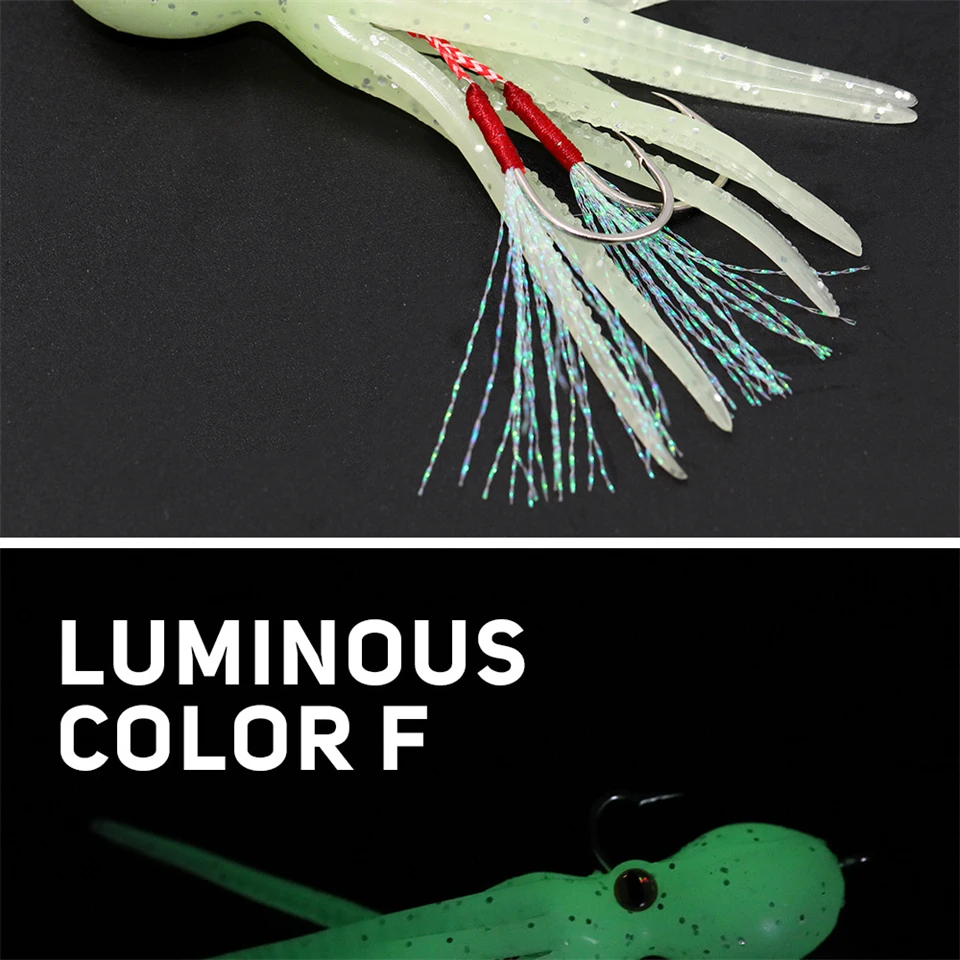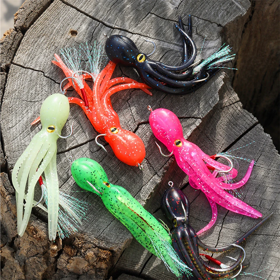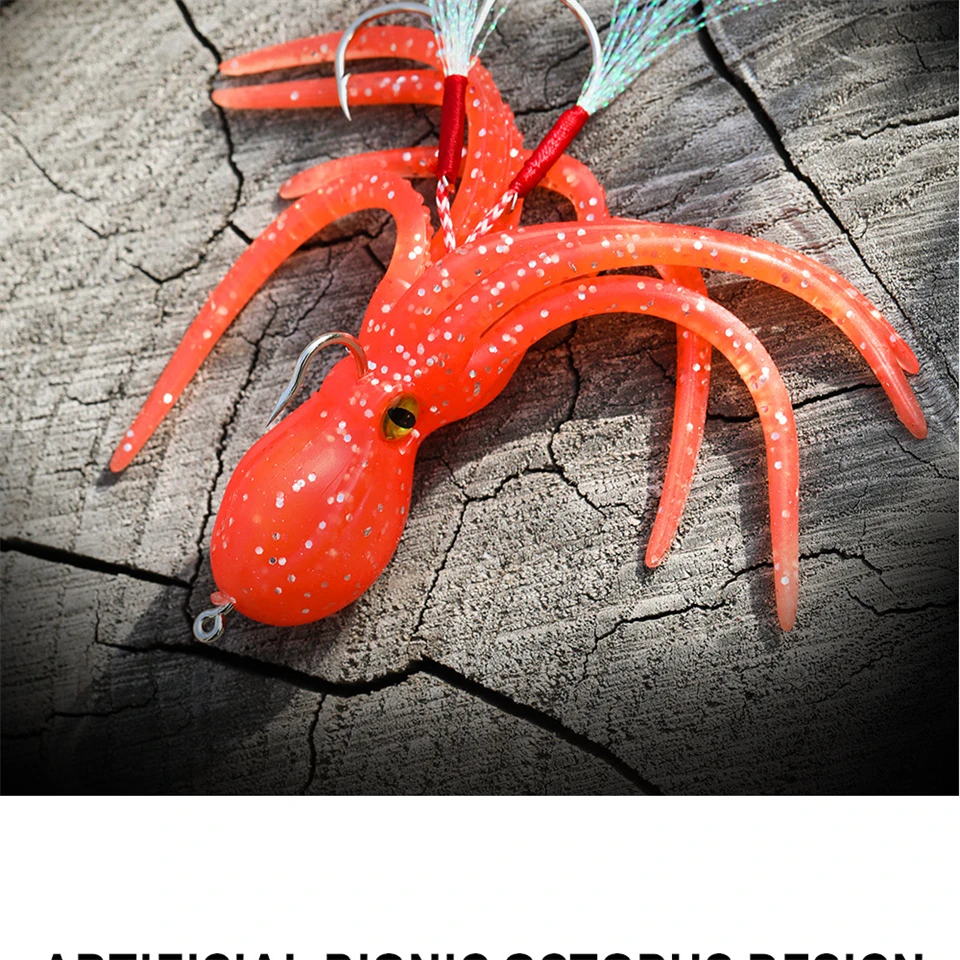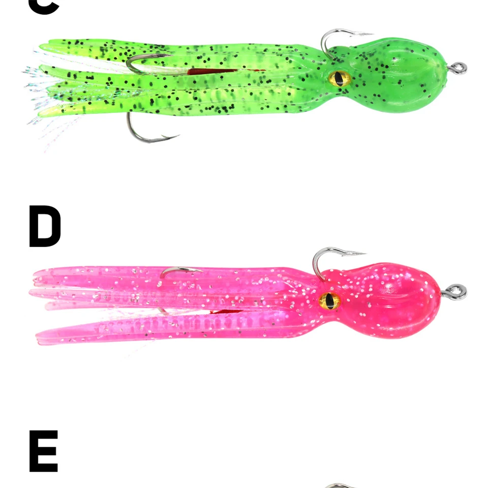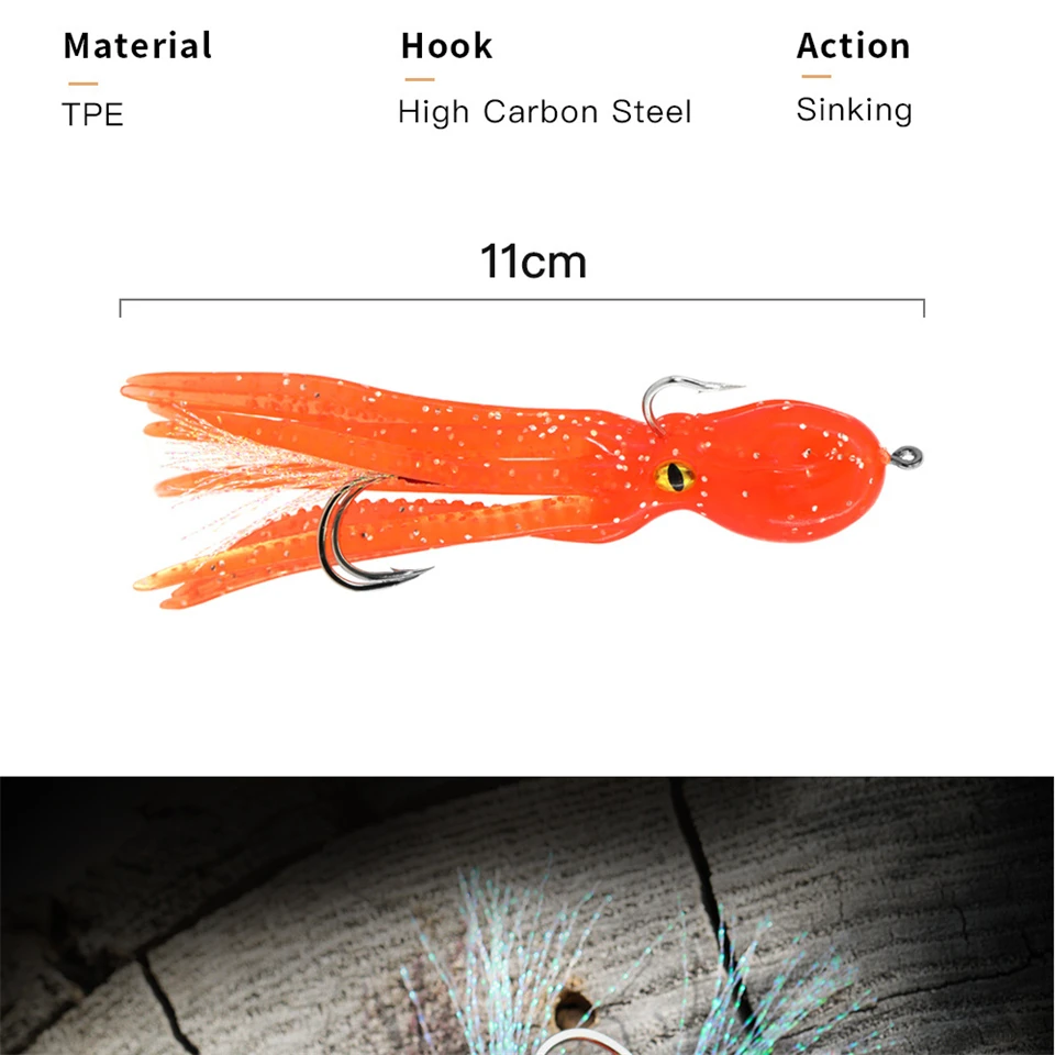 3. Bucles y anzuelos dobles: los anzuelos de púas individuales de alta calidad y los anzuelos triples están conectados a la cabeza para aumentar la tasa de captura de su pez objetivo. El lazo adicional en la parte superior del cebo de pulpo se puede conectar a otro gancho con una cabeza a presión.