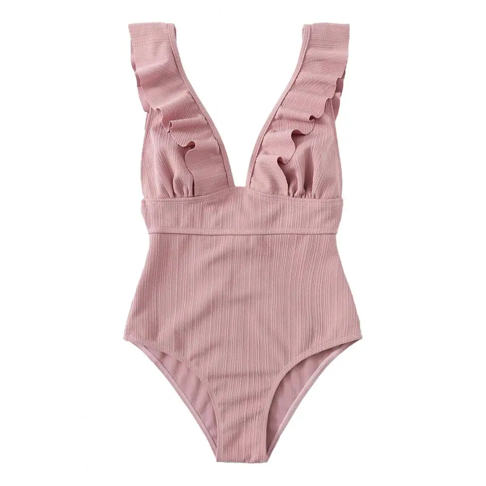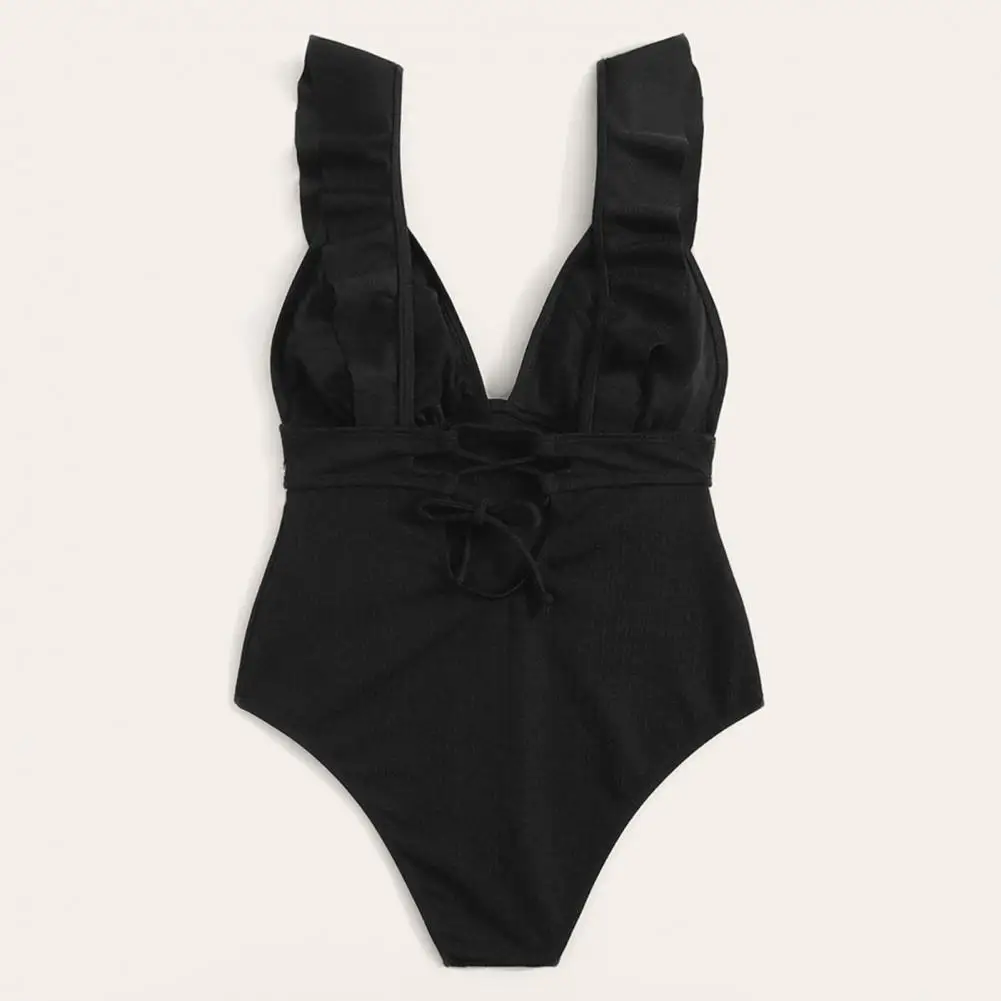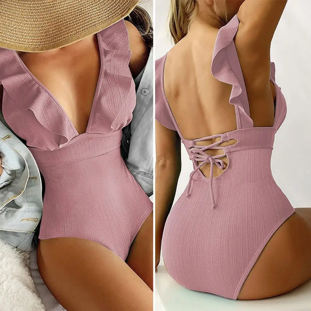 Su diseño de encaje en la espalda añade un sentido de diseño a este traje de baño. El diseño de color sólido y el diseño acanalado lo hacen muy simple e informal.