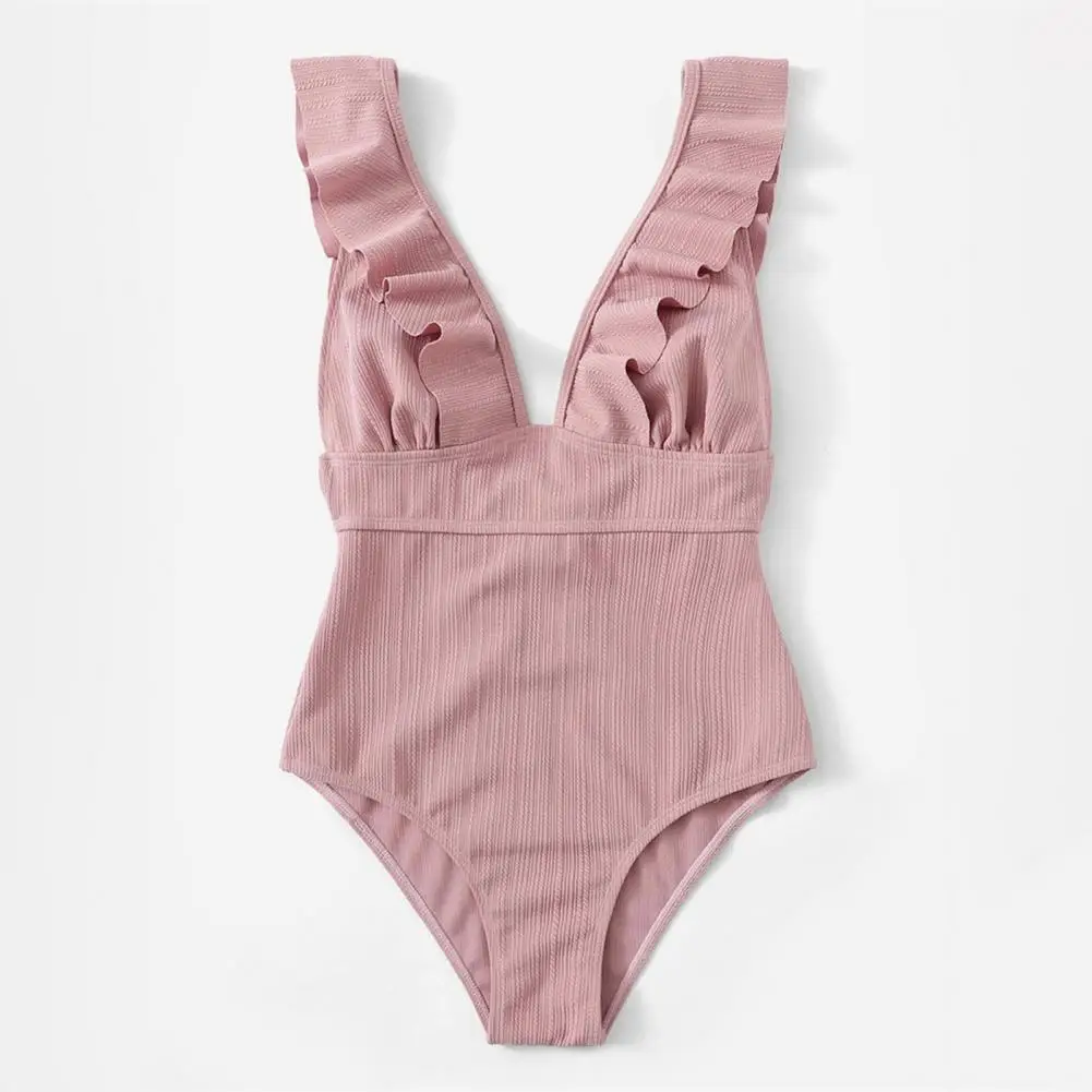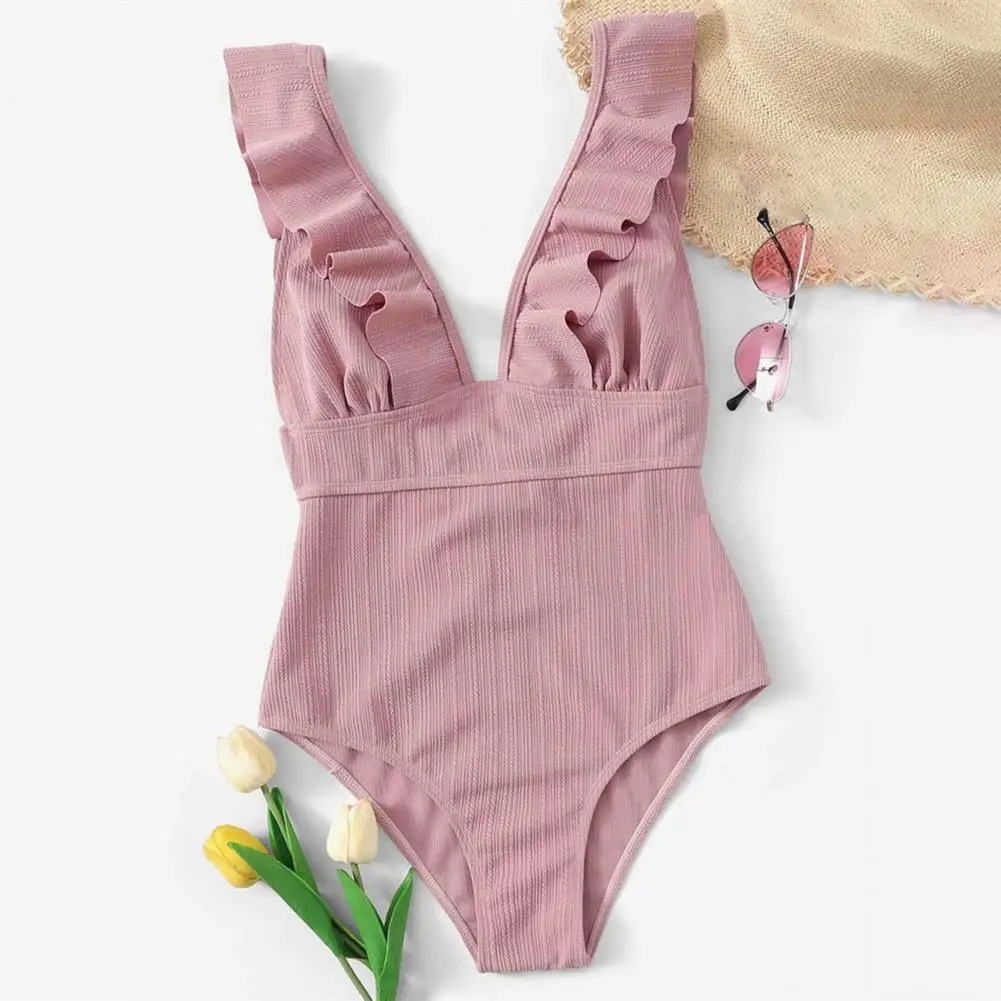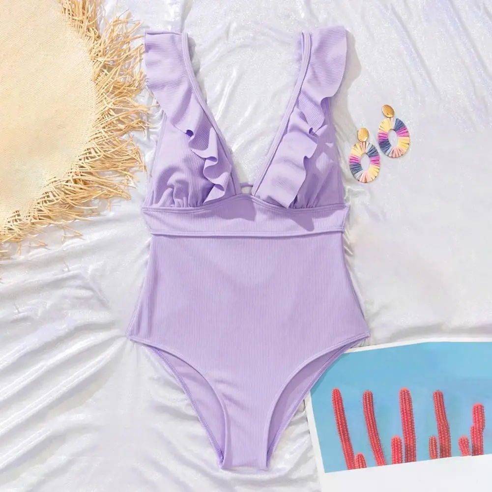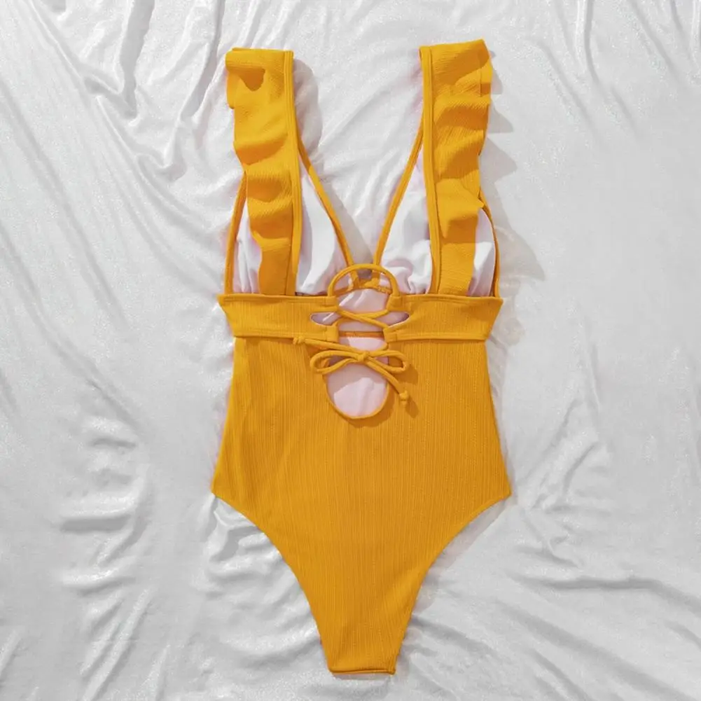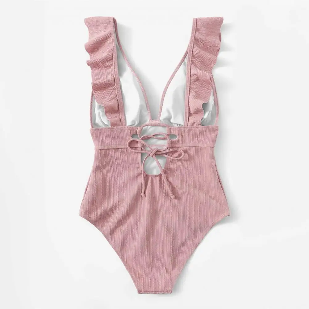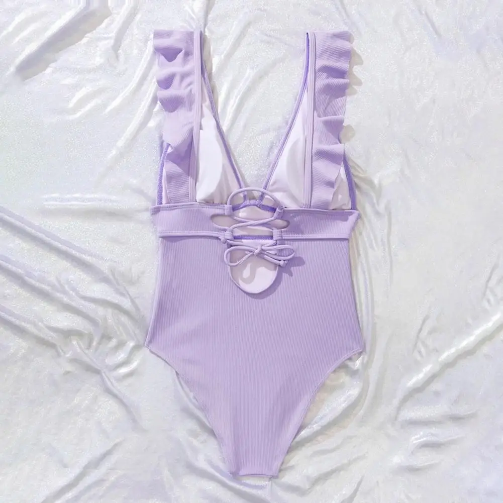 Su diseño de encaje en la espalda añade un sentido de diseño a este traje de baño. El diseño de color sólido y el diseño acanalado lo hacen muy simple e informal.