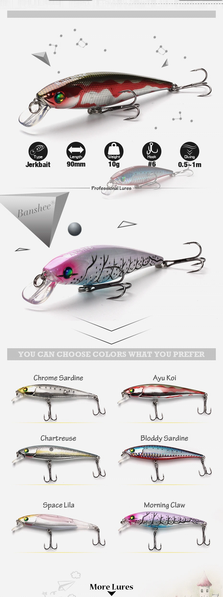 Banshee-señuelo de pesca flotante mnw35 de 90mm y 10g, sonajero, sonido poco profundo, cebo Artificial duro, Jerkbait, 6 unids/lote