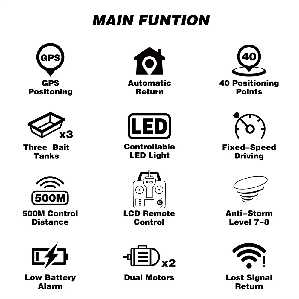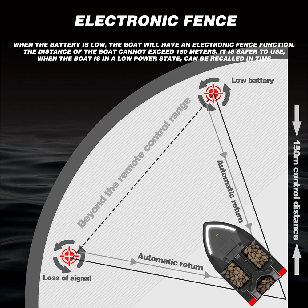 Devolución automática:La distancia del control remoto es de 500 metros. Cuando el barco esté con batería baja, pierda la señal o supere los 500 metros, volverá automáticamente. No tengas miedo de perder.
