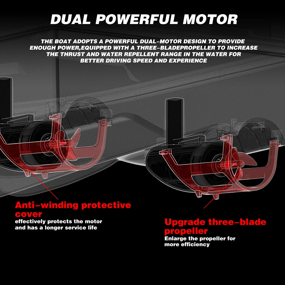 Potencia fuerte:Fuerte sistema de motor de doble potencia, funcionamiento silencioso, no molestará a los peces. La hélice de tres palas mejorada de alta eficiencia puede proporcionar una gran potencia y un crucero rápido.