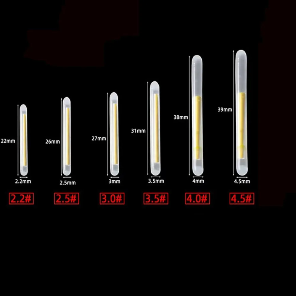 Nombre: Palo de luz nocturna de pesca Material: fluorescente + plástico Tamaño: 2,2*23mm/2,5*26mm /3*27mm/3,5*29mm /4*37mm/4,5*37mm Tipo luminoso: luminoso Color: transparente + amarillo. Adecuado para: pesca nocturna. Embalaje: Palo de luz nocturna de pesca de 50 piezas.