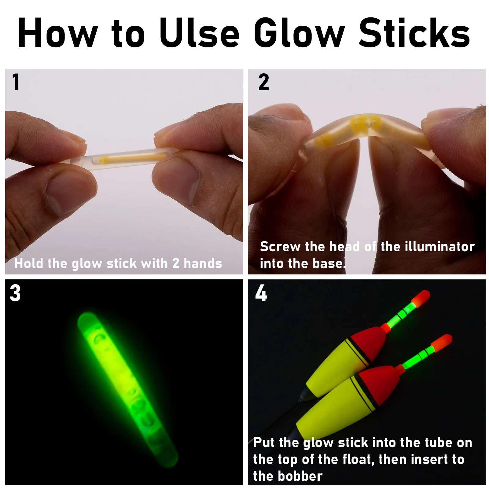 4. Proceso de activación fácil: simplemente dobla la mitad de la varilla luminosa para desmenuzar la bolita en el tubo, enchúfalo y agita para mezclar la bolita, y las varillas luminosas se iluminarán y brillarán. Insertarlos en los bobbers de pesca para la pesca nocturna.