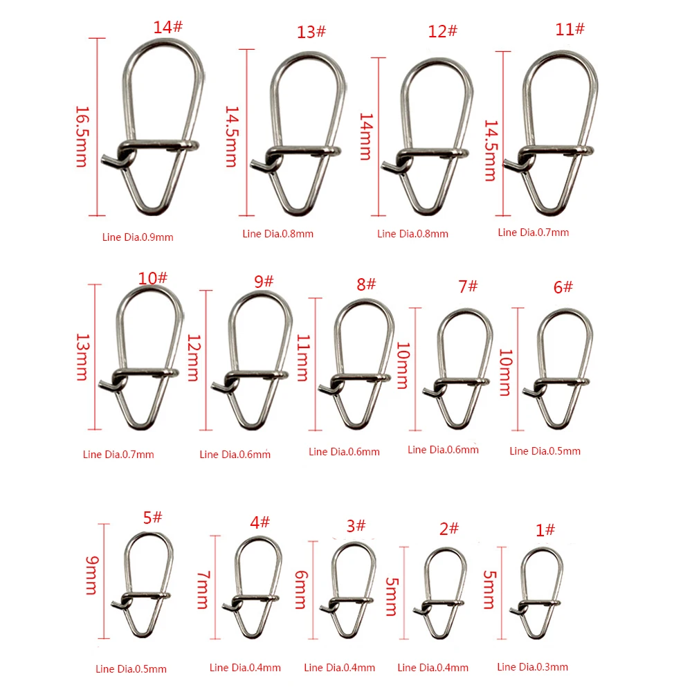 100% Brand new and high quality. Simple design for easy operation. Material: Stainless Steel Quantity: 100PCS Size:1# -14# Package Included: 100pcs fishing Hanging Snap.