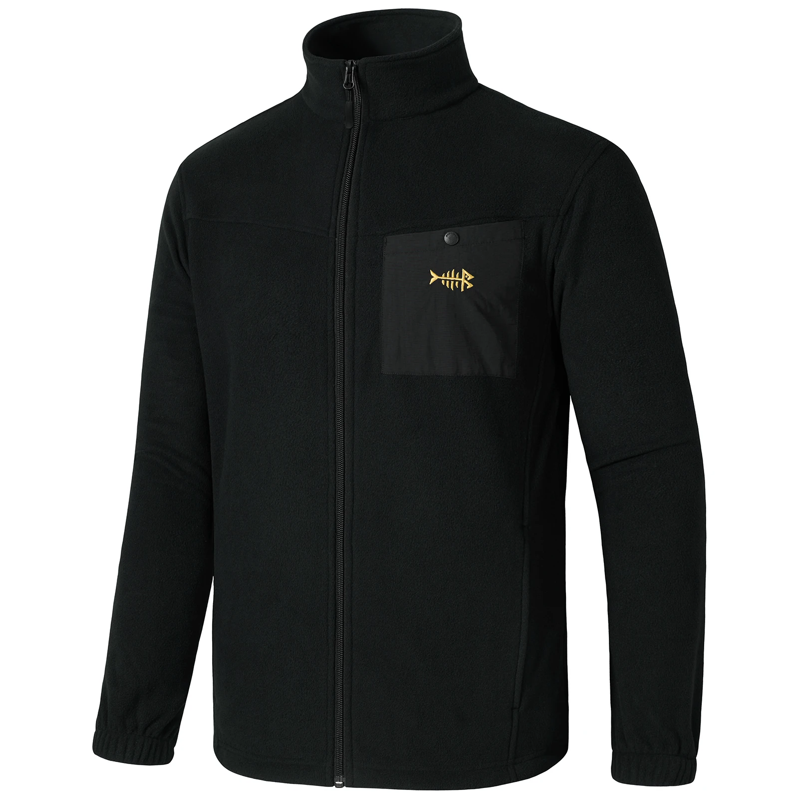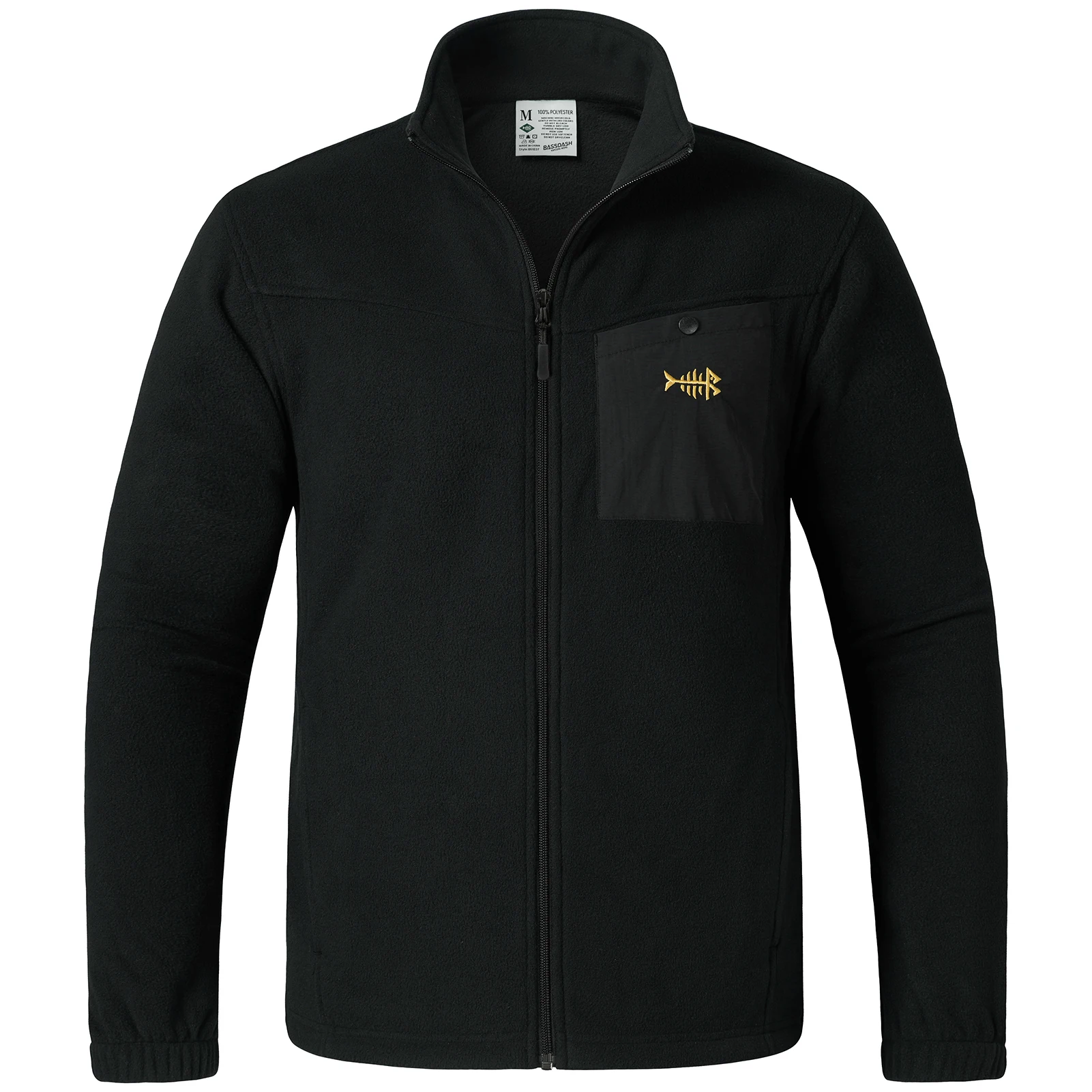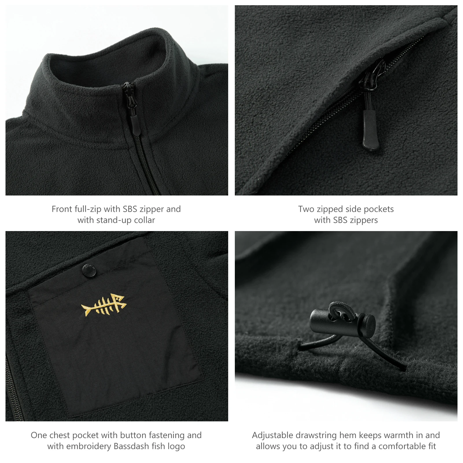 Diseño de múltiples bolsillos: un bolsillo en el pecho con cierre de botón y con logo de pez Bassdash bordado; dos bolsillos laterales con cremallera para calentadores de manos con cremalleras