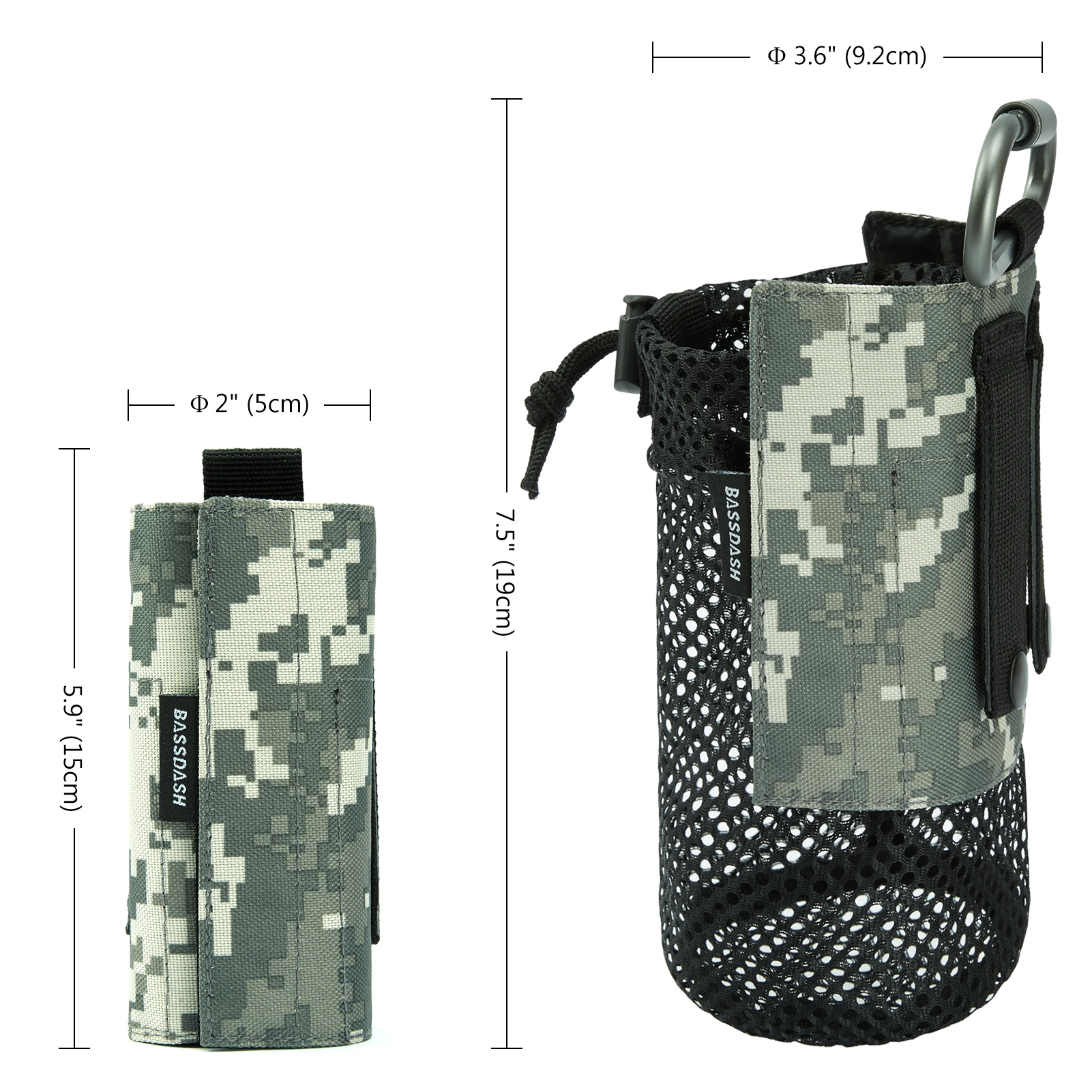 The pouch fits for most standard-size water bottles: it can hold water bottles whose diameter is up to 3.6” (9cm), and the height of the pouch is 7.5” (19cm)