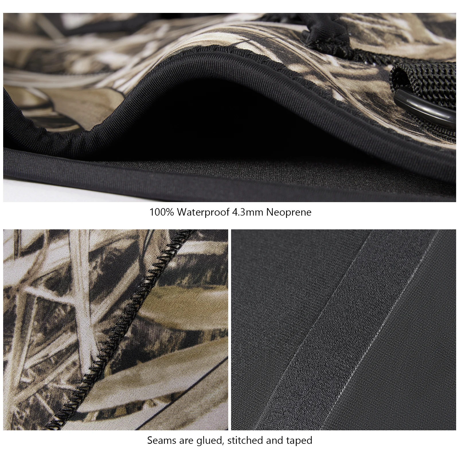 Hecho de neopreno elástico, impermeable y elástico de 4,3 mm, recubierto de poliéster para mayor durabilidad.