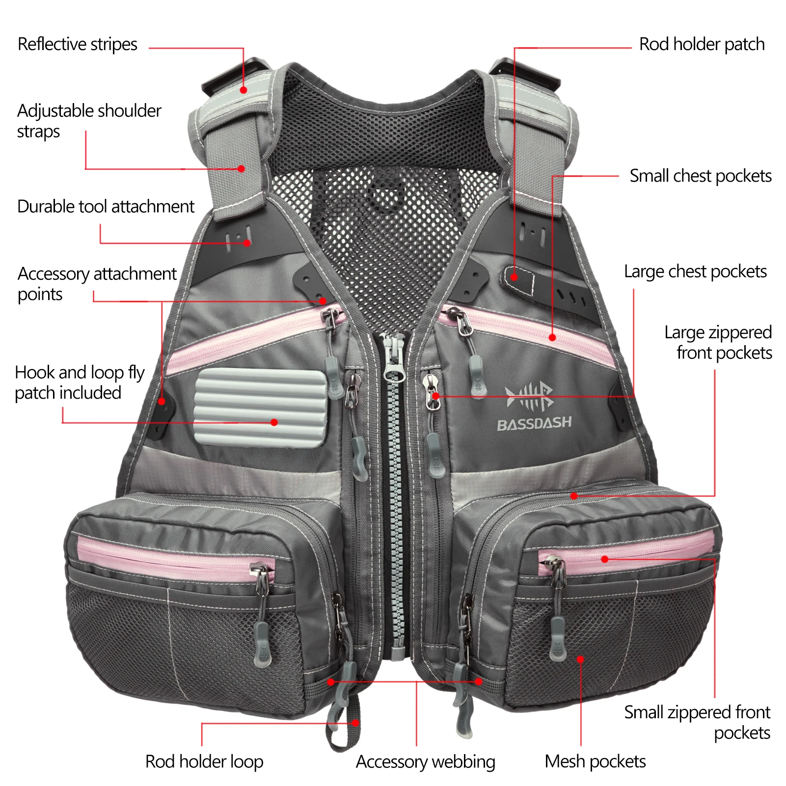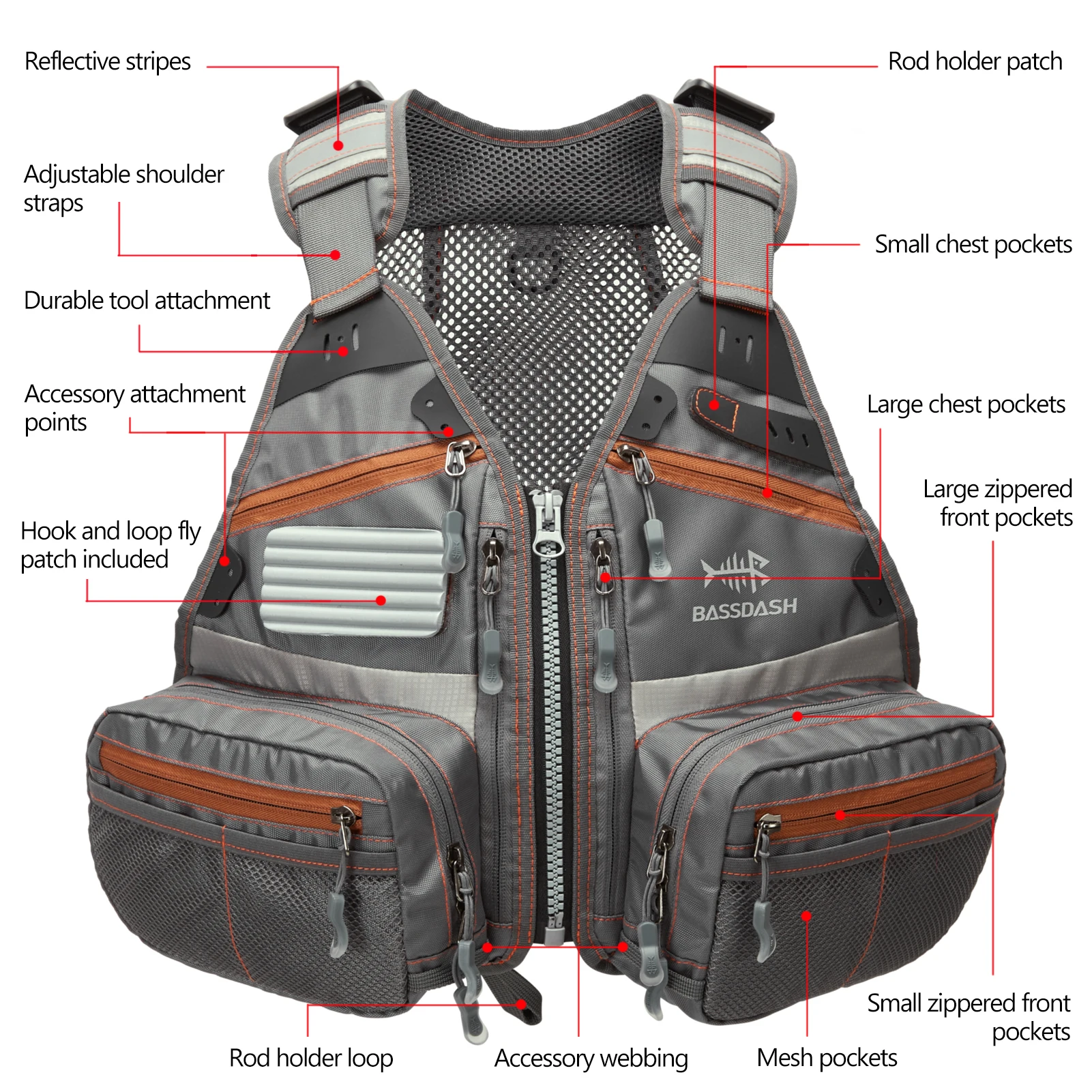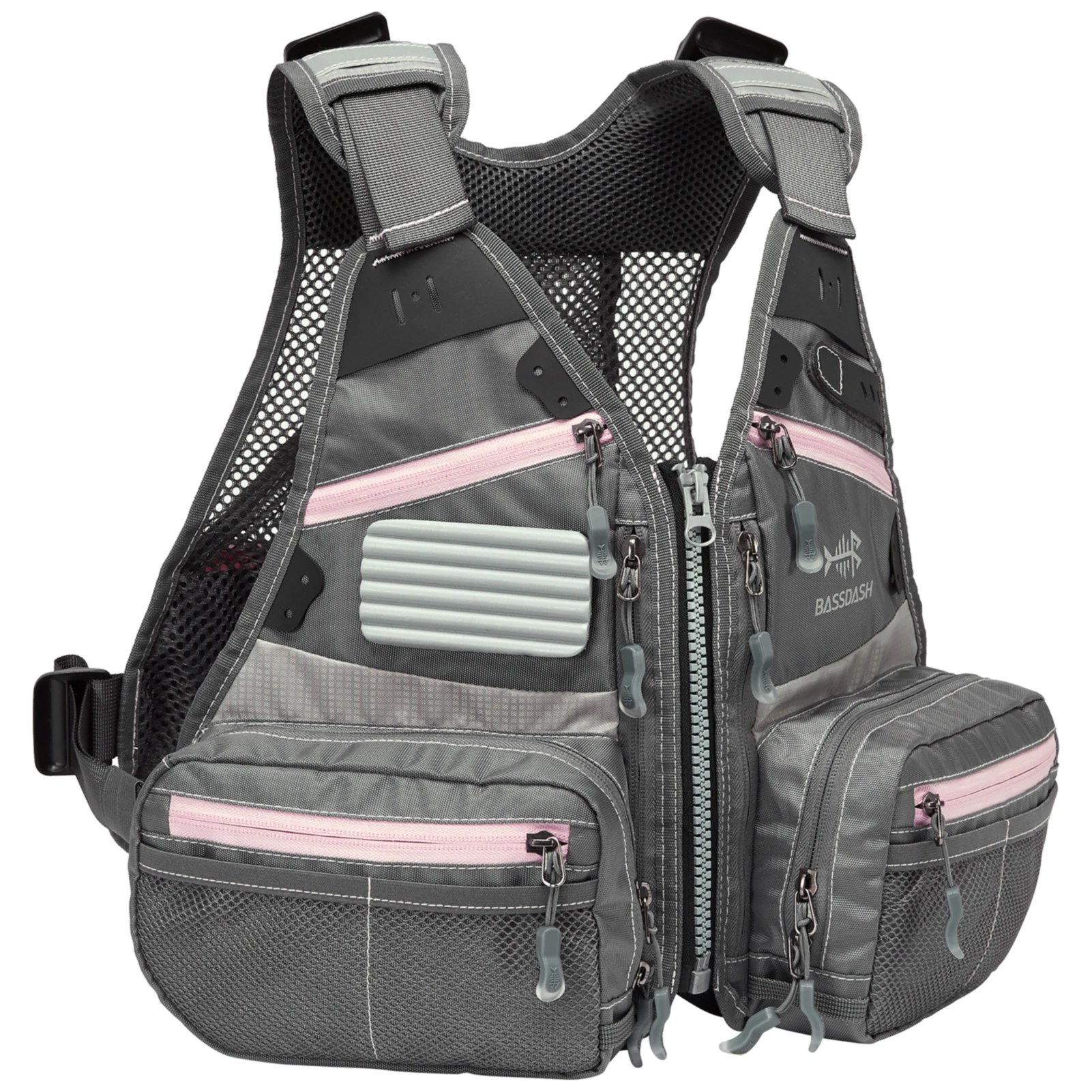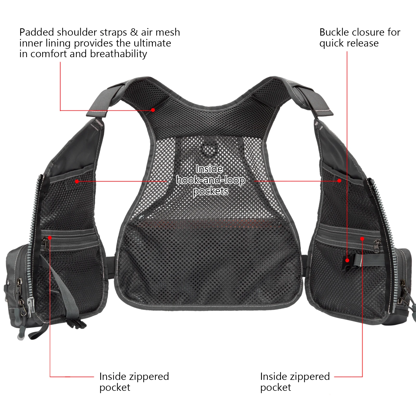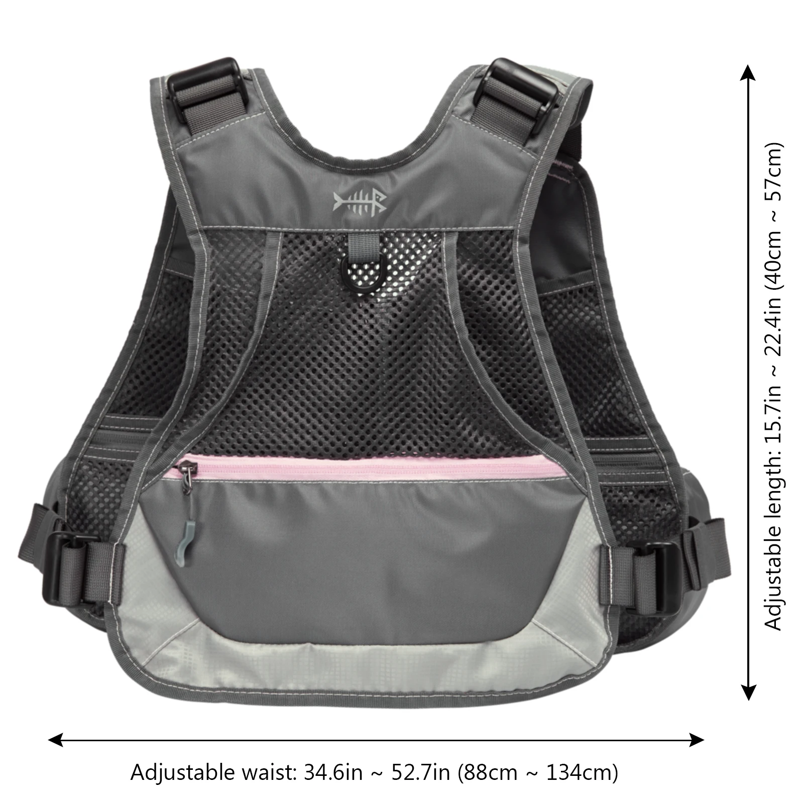 La correa ajustable para el esternón proporciona un uso alternativo del cierre de hebilla de liberación rápida; anillo en D en la parte posterior para sujetar una red de pesca; Bolsillo de almacenamiento de malla trasera compatible con la hidratación