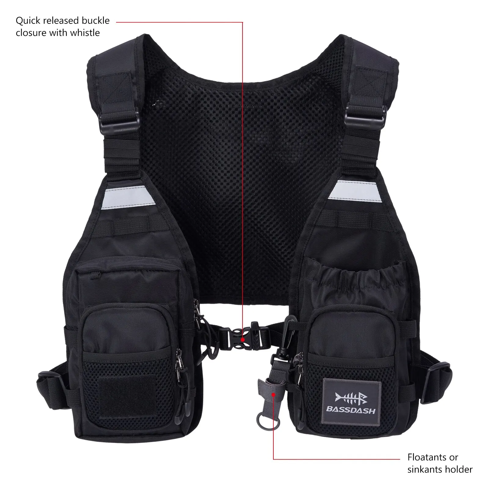 El chaleco del paquete del pecho FV08 que combina la flexibilidad de un chaleco de la pesca con la característica de la comodidad de un paquete del pecho es ideal para el pescador corto de la sesión que quiere viajar ligero; perfecto para su uso con waders o para la pesca en los meses cálidos