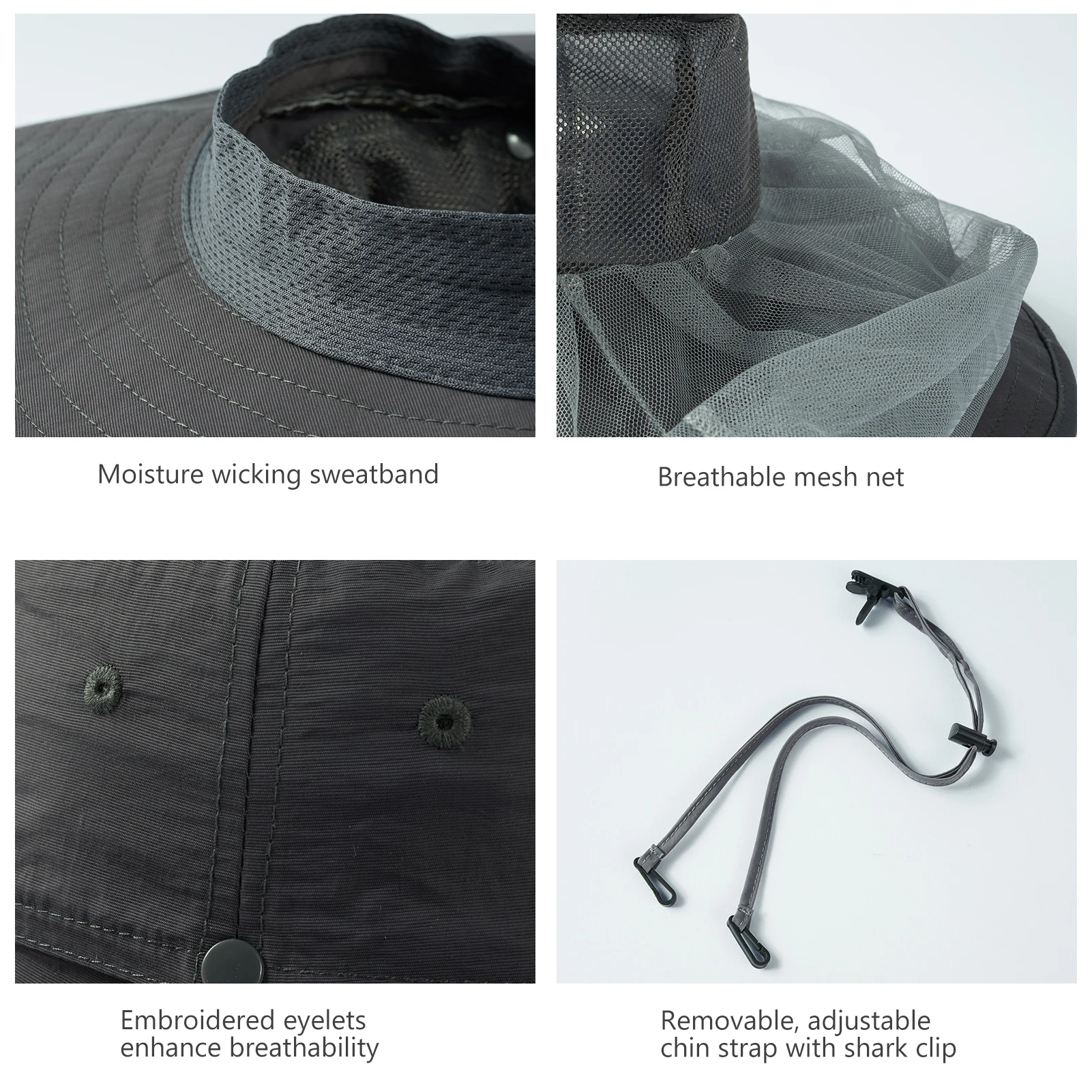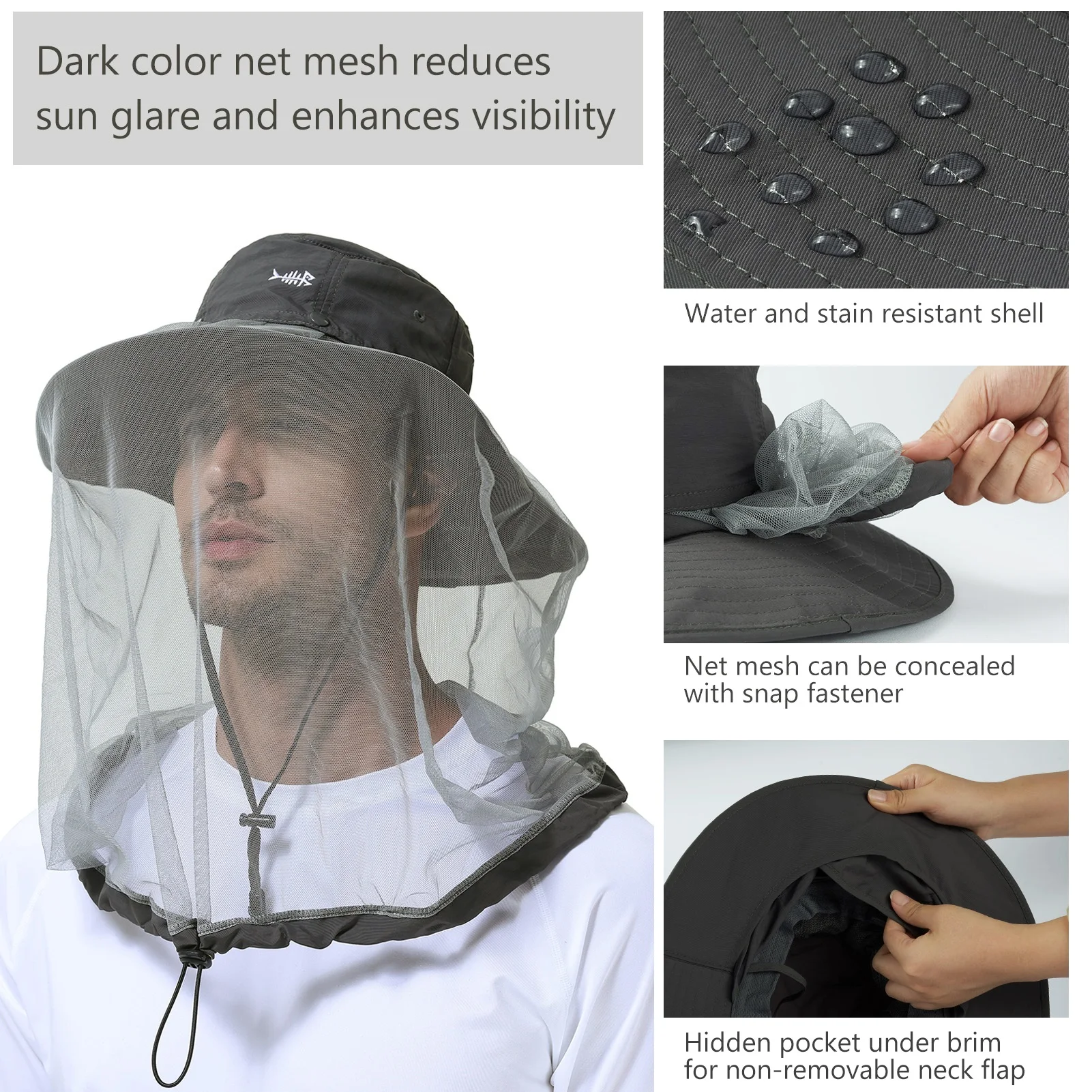 Cuenta con 14.Mosquitera de 6 pulgadas de largo para proteger su cara y cuello de esos molestos mosquitos, mosquitos y otros insectos picantes;La malla de red de color oscuro reduce el resplandor del sol y mejora la visibilidad;La malla de red se puede ocultar cuando no esté en uso; simplemente enróllela y dóblela en el bolsillo hacia abajo alrededor del sombrero, lo que permite que el sombrero sea un sombrero de sol boonie normal.