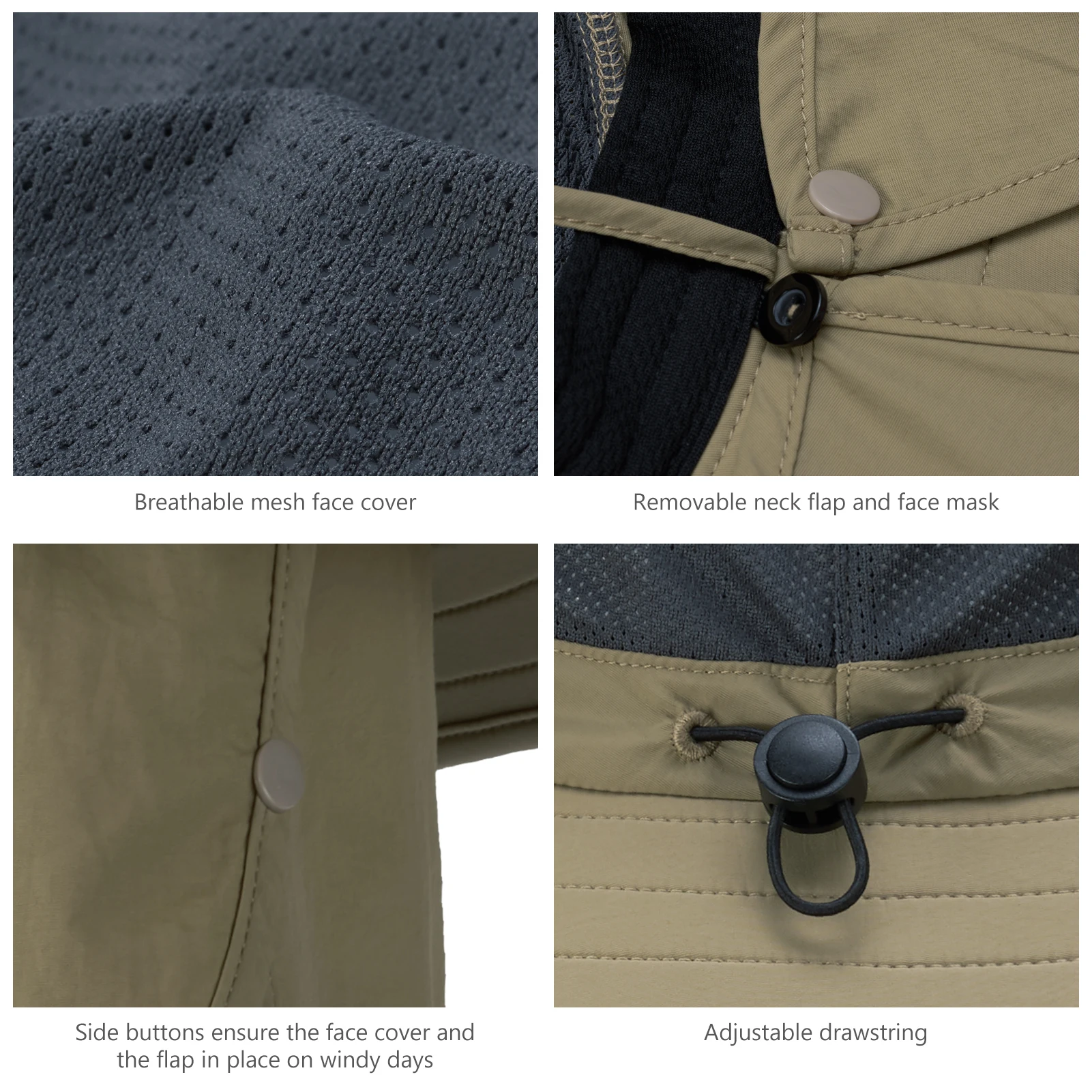 Cuenta con ala ancha y cubierta facial extraíble y solapa para el cuello para protegerlo contra los dañinos rayos UV desde diferentes ángulos y ofrecer protección solar de 360 grados para su cara, orejas y cuello; la cubierta de la cara y la solapa del cuello son desmontables para proporcionar múltiples formas de uso para adaptarse a sus diferentes necesidades