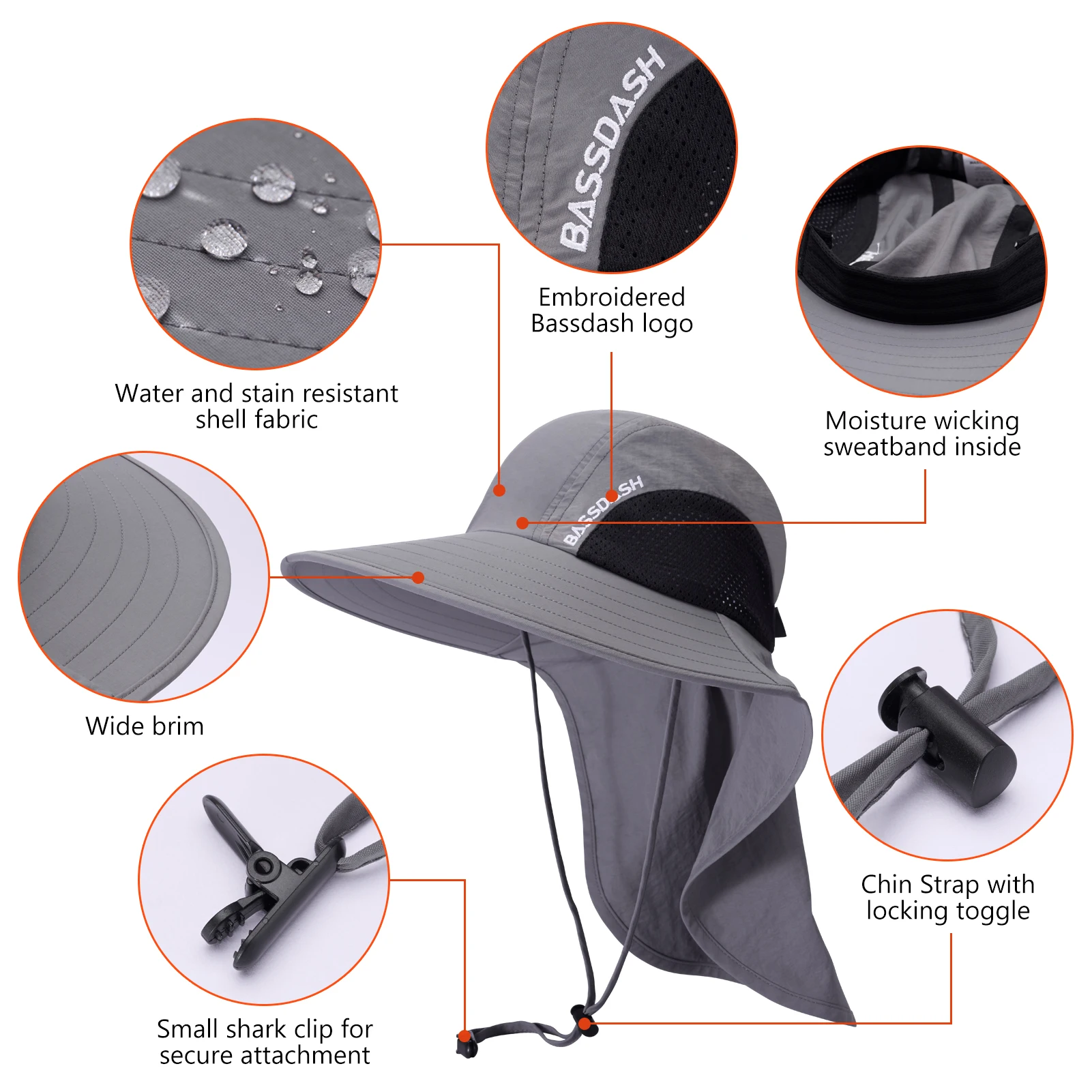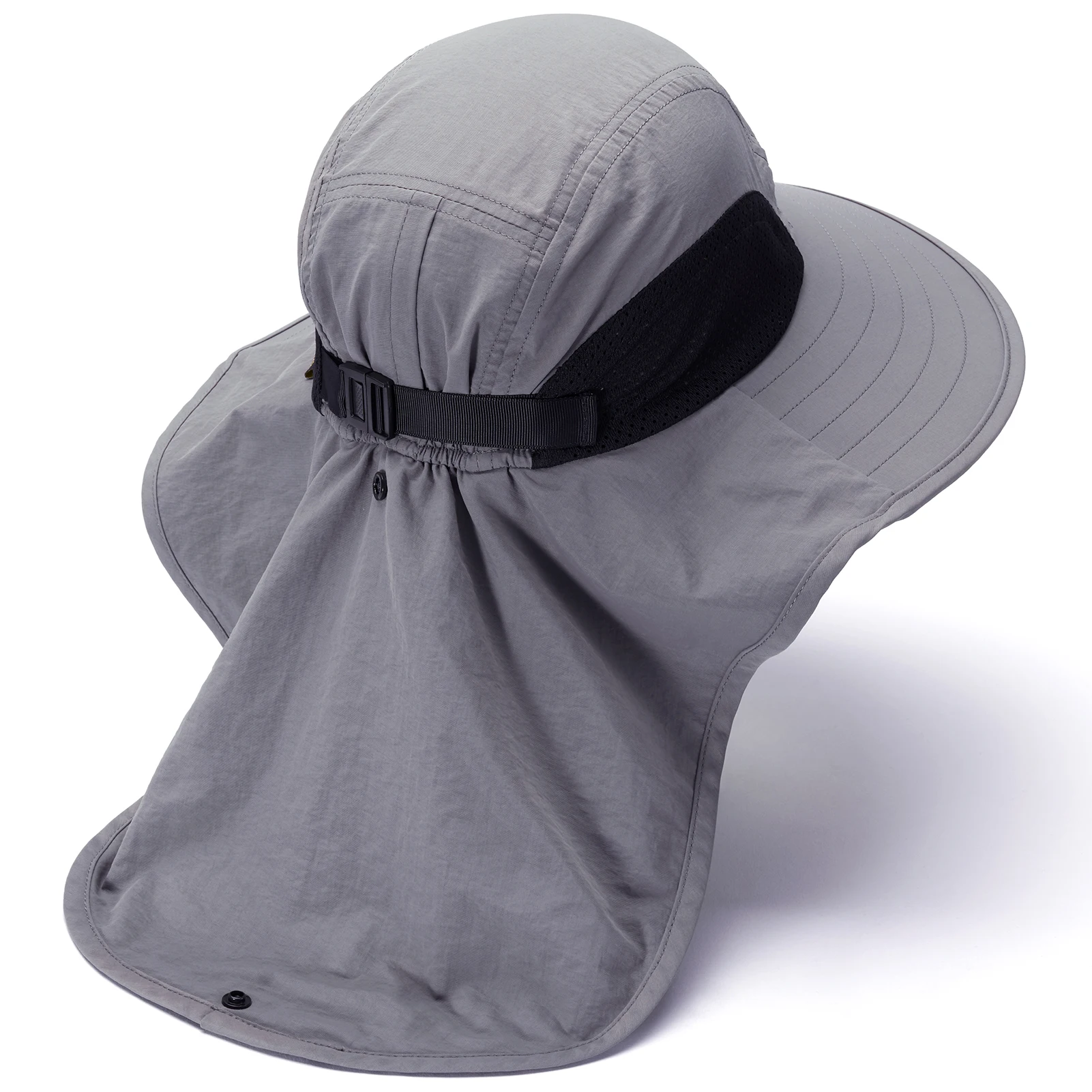The hidden ponytail hole can keep your hair up and off your neck to make you cooler, and the hole is unobvious when it is not in use; The back buttons are designed to allow you to lift the neck cape for added breathability and that meanwhile changes the style; A small shark clip on the chin strap for secure attachment of your hat to your other gears like backpack, wader, etc.