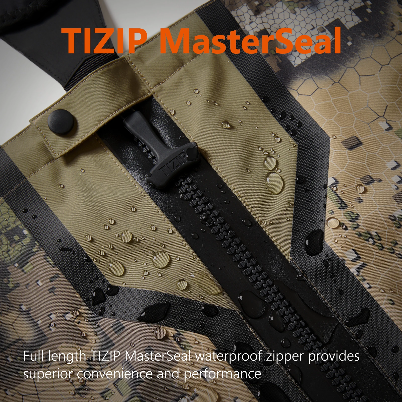 Protección totalmente impermeable: cuenta con una cremallera frontal impermeable TIZIP MasterSeal 10 para poner y quitar fácilmente y un sellado completo de agua.