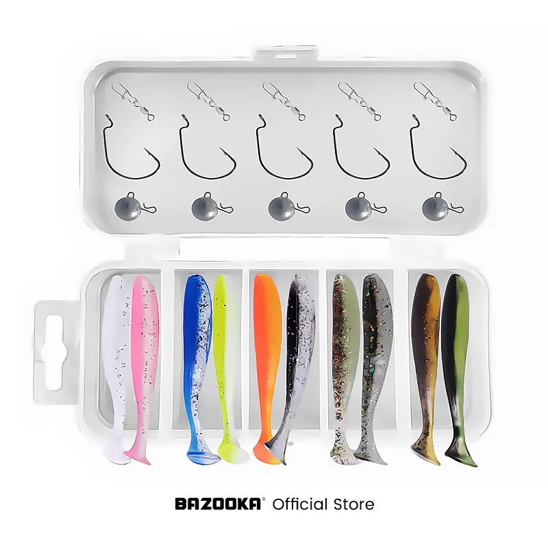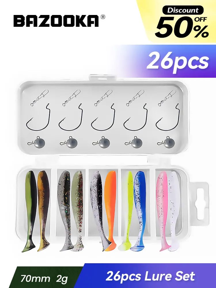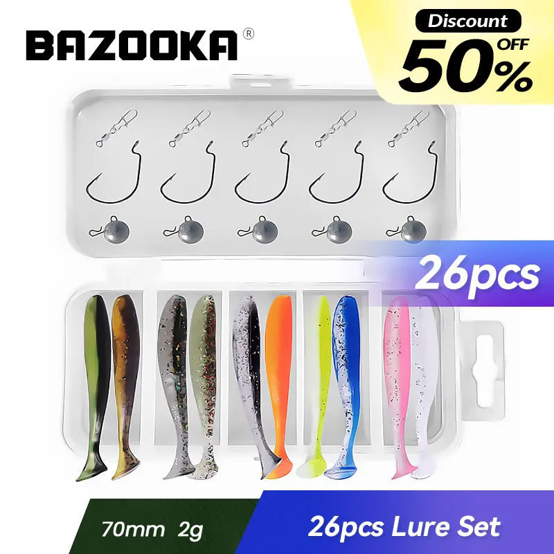 Bazooka-Juego de Señuelos blandos de pesca, 26 Uds., cebo de silicona, gusano, Wobbler, Jiging, anzuelos de plomo, cuchara, carpa, lubina, Lucio con caja