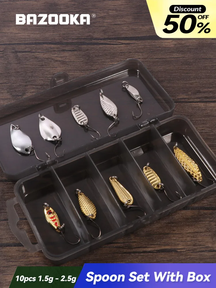 Juego de cuchara Bazooka, señuelo de pesca, cebos giratorios de Metal para trucha, Leurre duro, Kit de plantilla Artificial Spinnerbait de cobre, aparejos de invierno con caja