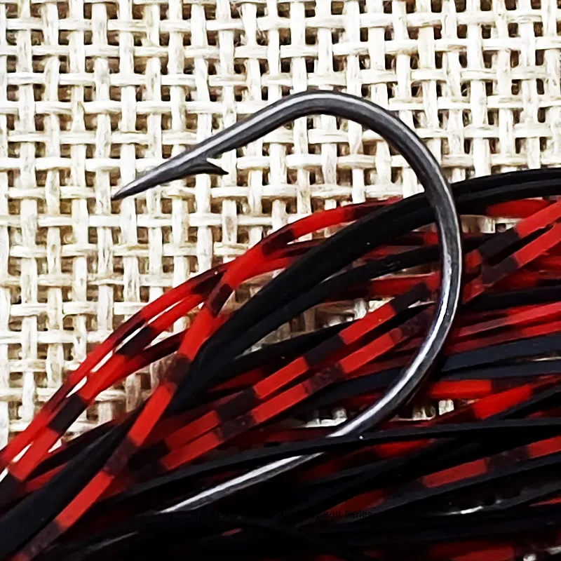 Cada MadBite Swim Jig utiliza solo los ganchos de punta de aguja 4/0 finos, más afilados y más duraderos acabados en niquelado negro. Los ganchos de alambre pesados y pegajosos resisten el uso en condiciones de cobertura pesada y se mantendrán fuertes incluso con los juegos de ganchos más violentos. Un soporte de plástico blando incorporado mantiene los cebos de remolque en su lugar a través de muchos moldes y en una cubierta pesada.