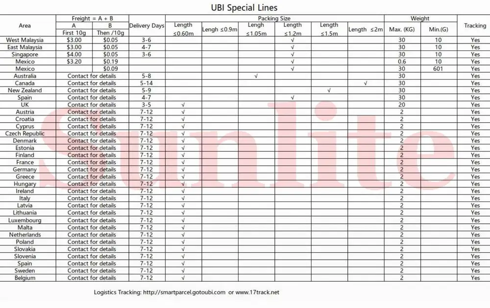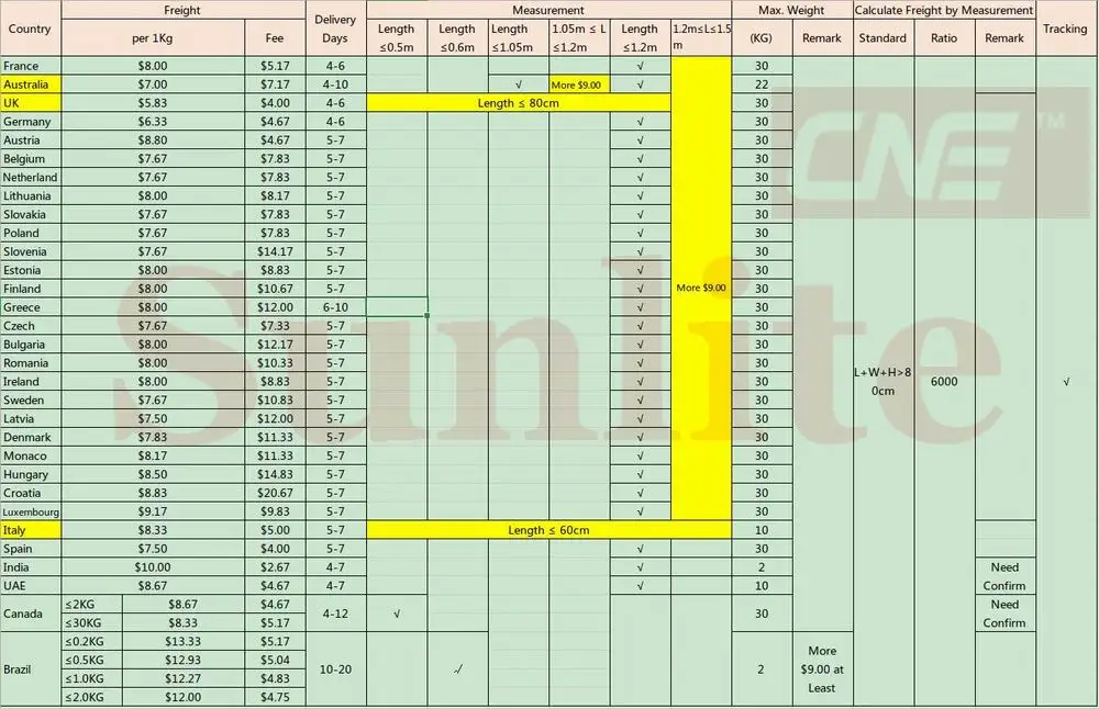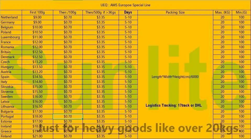 DHLSe añadirá 130,00 $ si el paquete supera los 120cm.CNEAFrancia, Sin paquetes de cilindros.UBIACanadá, Sin paquetes de cilindros.UBINo envía paquetes de más de 60cm aReino Unido.