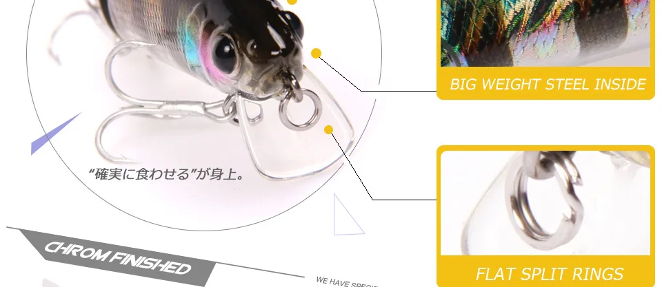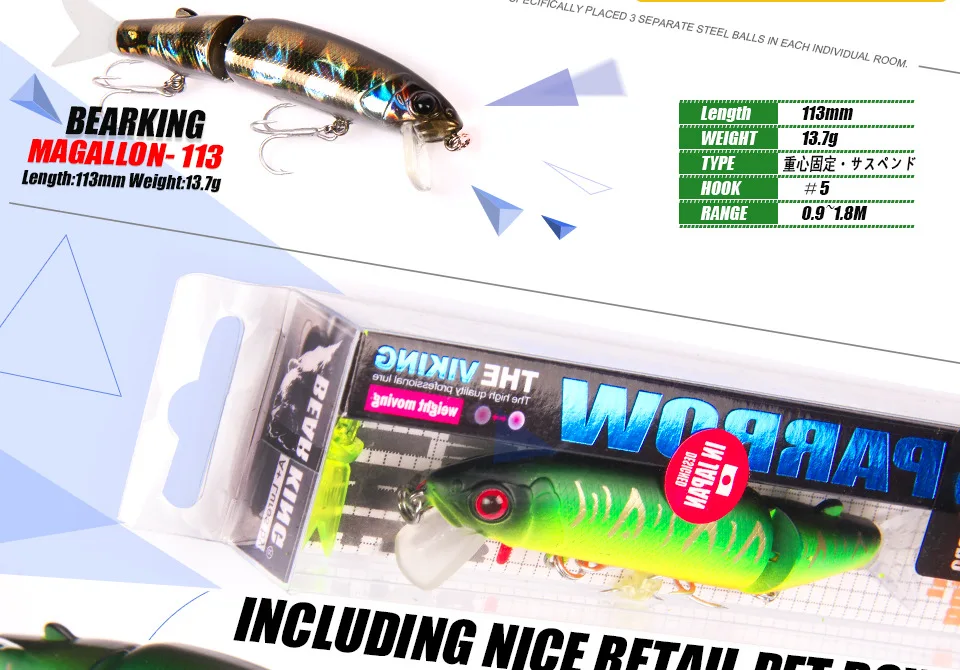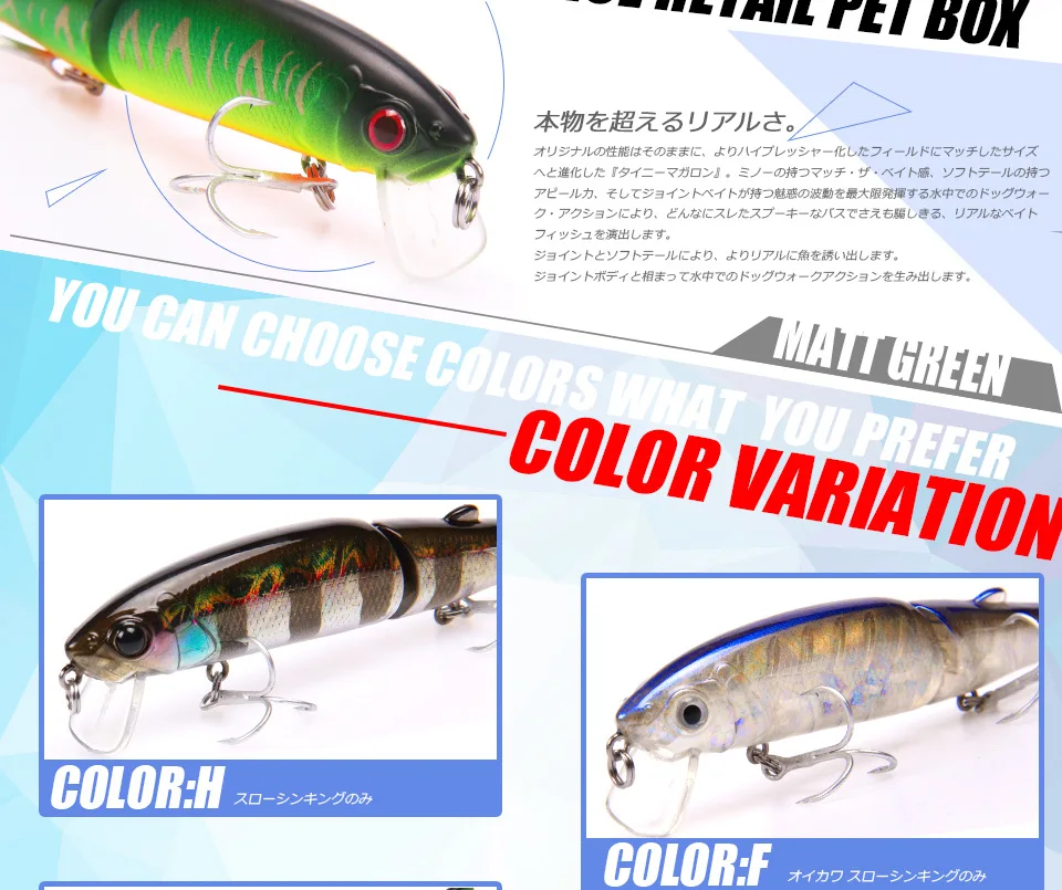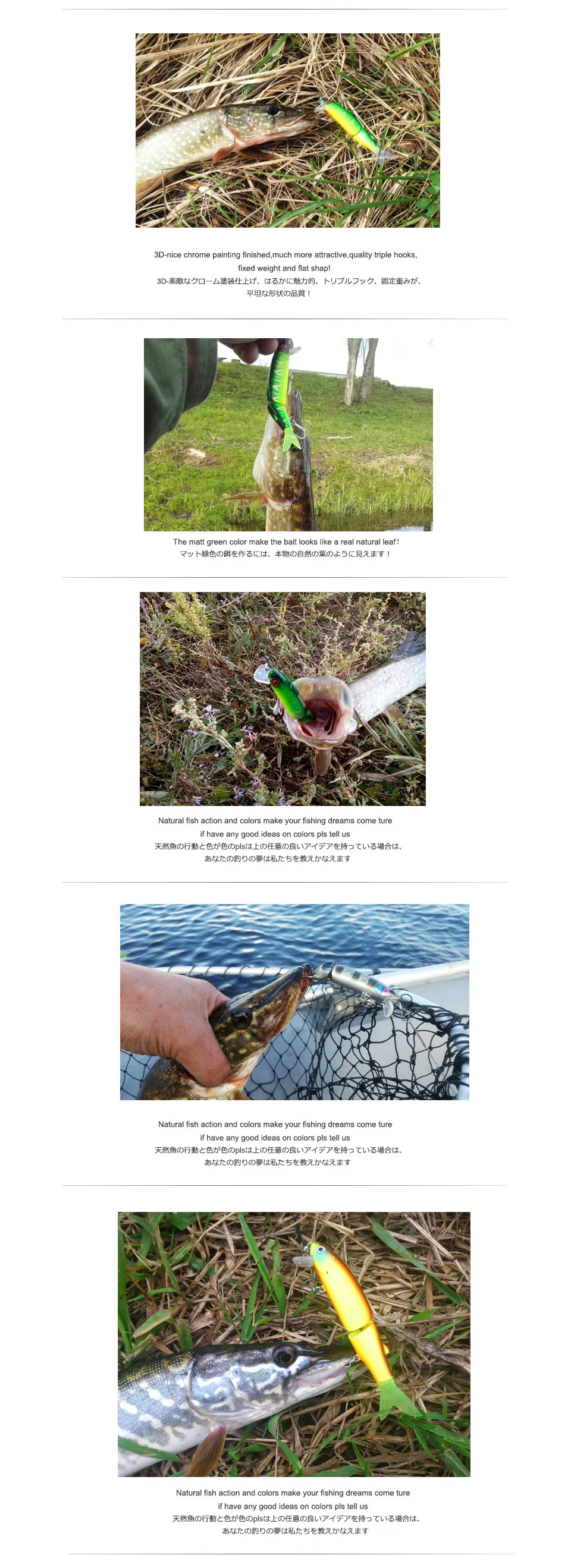 1.Bearking 2x anzuelos triples fuertes: está armado con ganchos de bearking, potencia más fuerte, duradero, agua de mar de agua dulce universal.2. Piel de pez de simulación (láser): el diseño de piel de pez de simulación lo hace más atractivo para los peces grandes.3. Anillos bicíclicos más fuertes: fortalece el círculo doble y aumenta la resistencia a tirar.4.3 ojos de pez: ojos de simulación 3D, grande y brillantes, más tentadores, mejore reflectantes.5. Embalaje del producto: Cada cebo se embala en una bonita caja de pvc al por menor.
