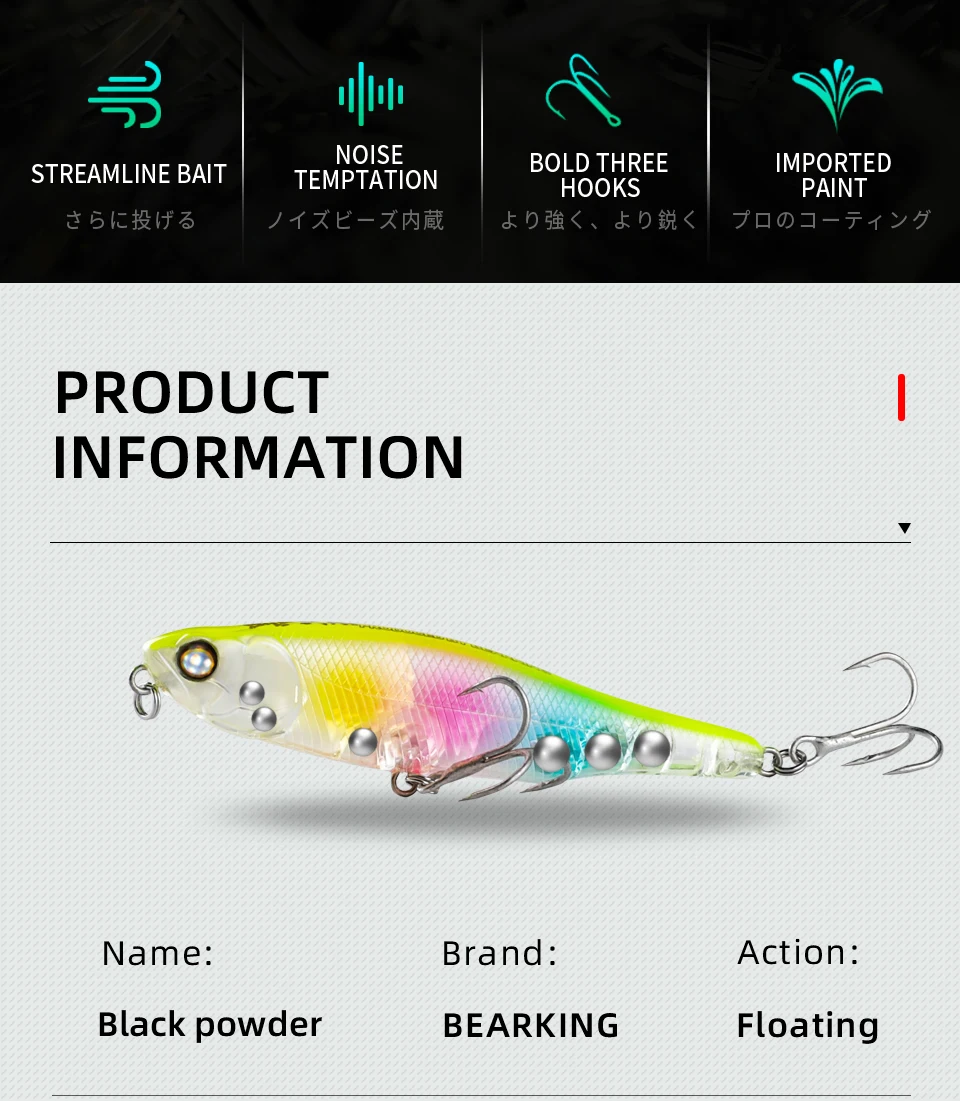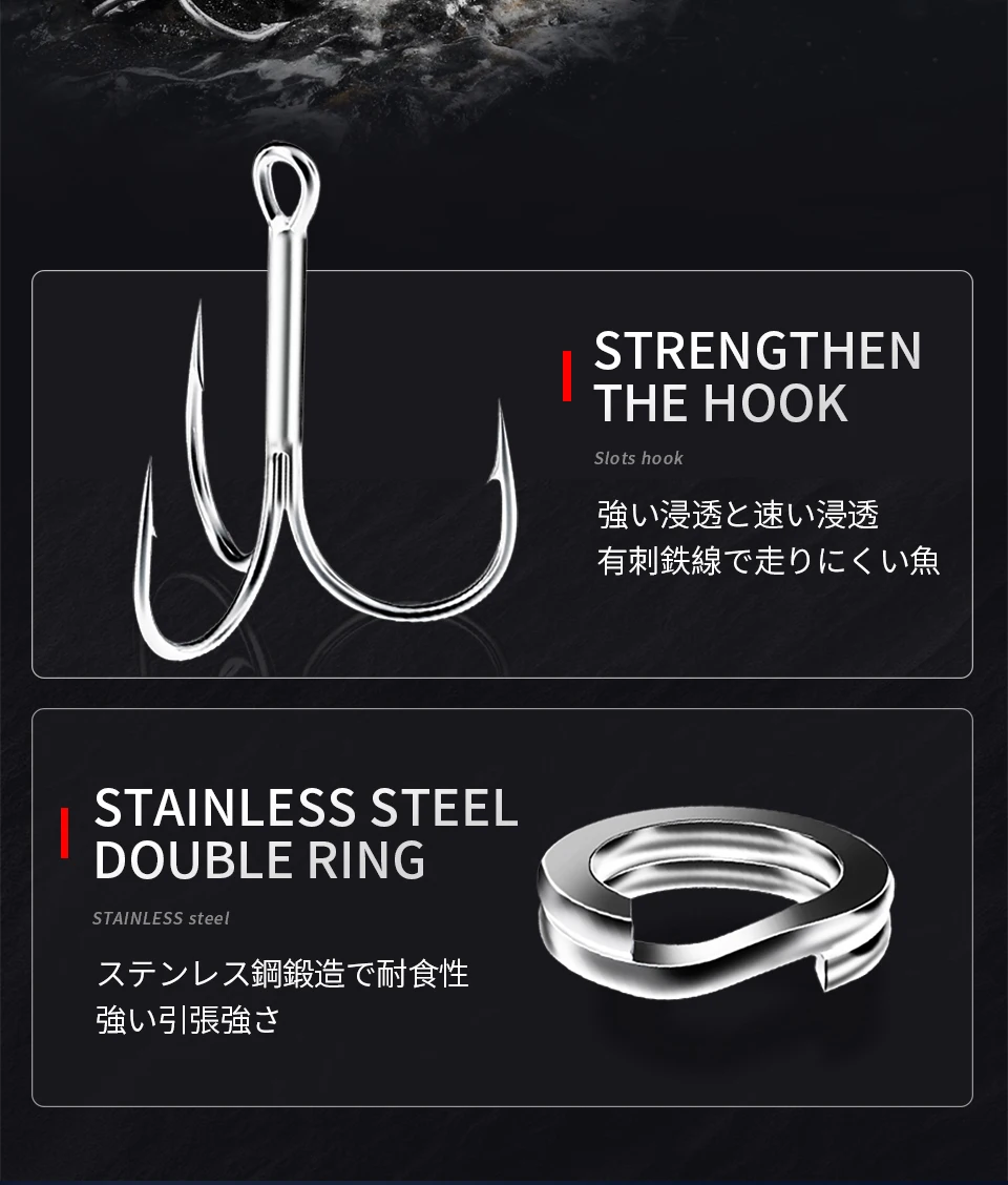 1. Rodamiento de 2 ganchos triples fuertes: está armado con ganchos de rodamiento, mayor potencia, duradero, agua de mar dulce universal.2.Piel de pez de simulación (laser): el diseño de la piel de pez de simulación la hace más atractiva para los peces grandes.3.Anillos bicíclicos más fuertes: fortalecen el doble círculo y aumentan la resistencia al tirón.Ojos de pez 4.3D: ojos de simulación 3D, grandes y brillantes, más tentadores y reflectantes.5.Embalaje del producto: cada cebo está empaquetado en una bonita caja de PVC al por menor.6.Regalo:Cada cebo incluye una pegatina de aparejos de pesca.
