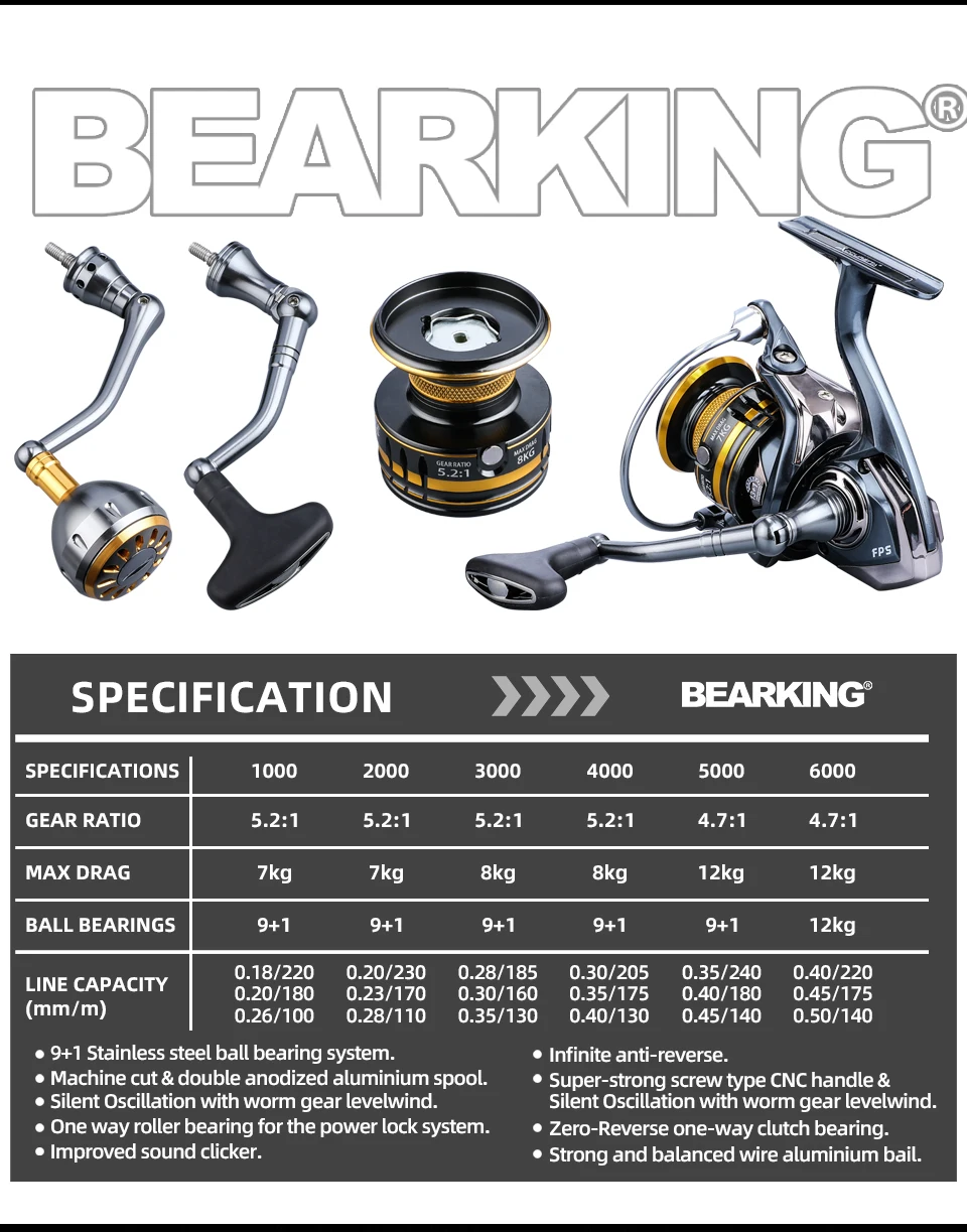 BEARKING marca nueva llegada carrete de pesca de agua salada Spinning 1000-6000 9 + 1BB 5,2: 1 arrastre máximo 12KG carretes a prueba de agua