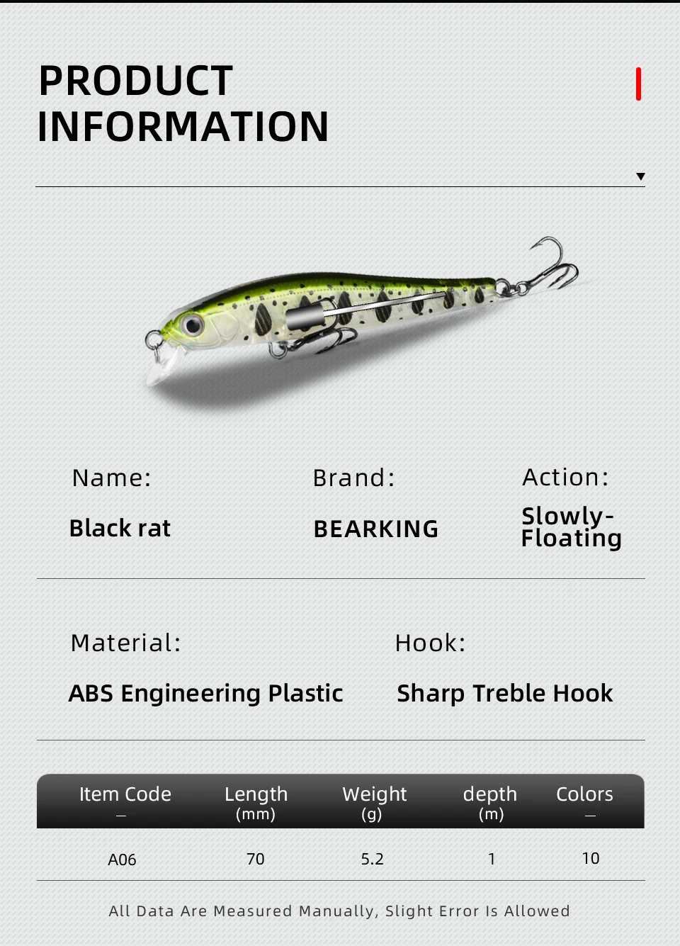 BEARKING modelo caliente 70mm 5,2g calidad profesional Magent peso Señuelos de pesca Minnow manivela cebo Artificial aparejos A06