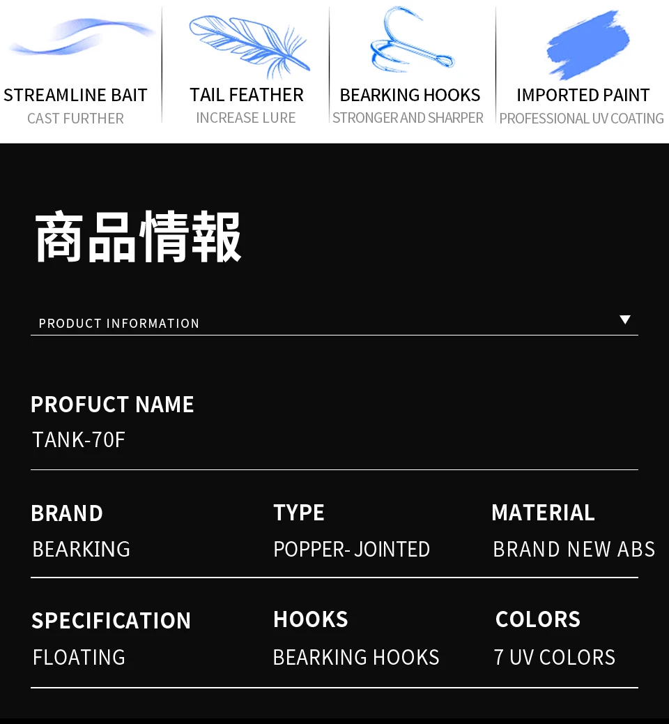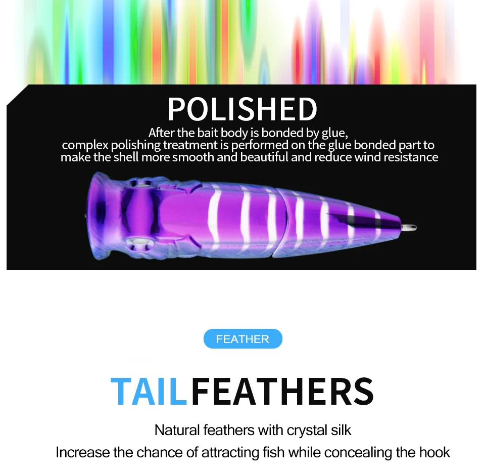 1. Rodamiento de 2 ganchos triples fuertes: está armado con ganchos de rodamiento, mayor potencia, duradero, agua de mar dulce universal.2.Piel de pez de simulación (laser): el diseño de la piel de pez de simulación la hace más atractiva para los peces grandes.3.Anillos bicíclicos más fuertes: fortalecen el doble círculo y aumentan la resistencia al tirón.Ojos de pez 4.3D: ojos de simulación 3D, grandes y brillantes, más tentadores y reflectantes.5.Embalaje del producto: cada cebo está empaquetado en una bonita caja de PVC al por menor.