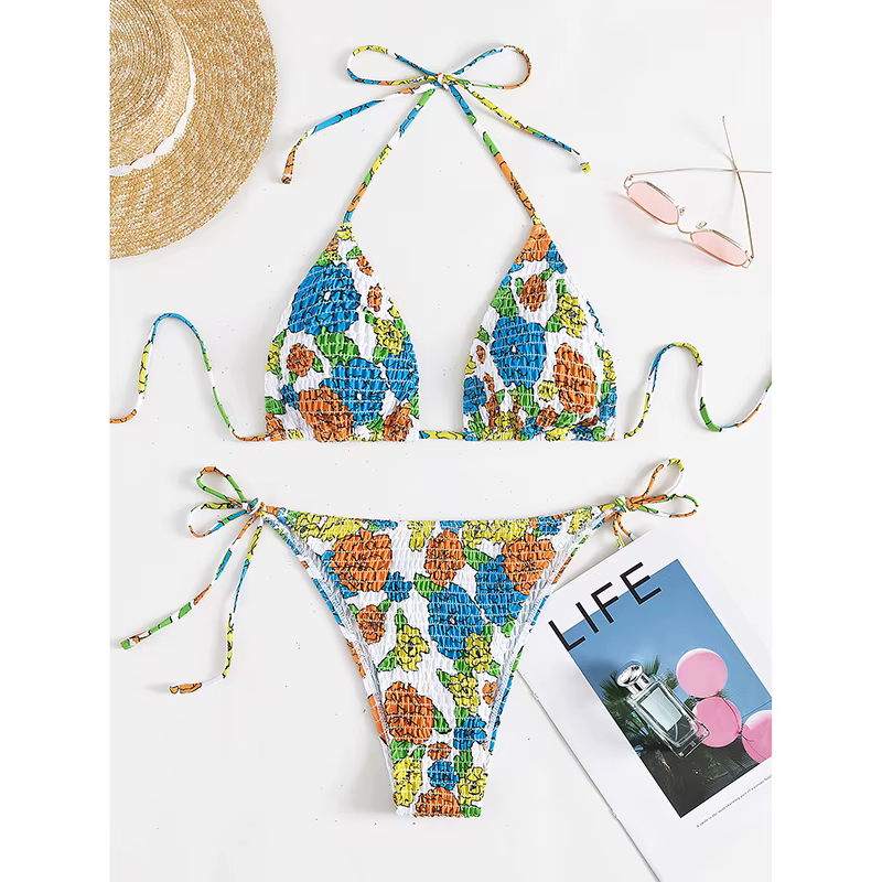 Bikini triangular con cuello Halter para mujer, conjunto de dos piezas con estampado de flores, plisado, con lazo lateral, traje de baño Sexy