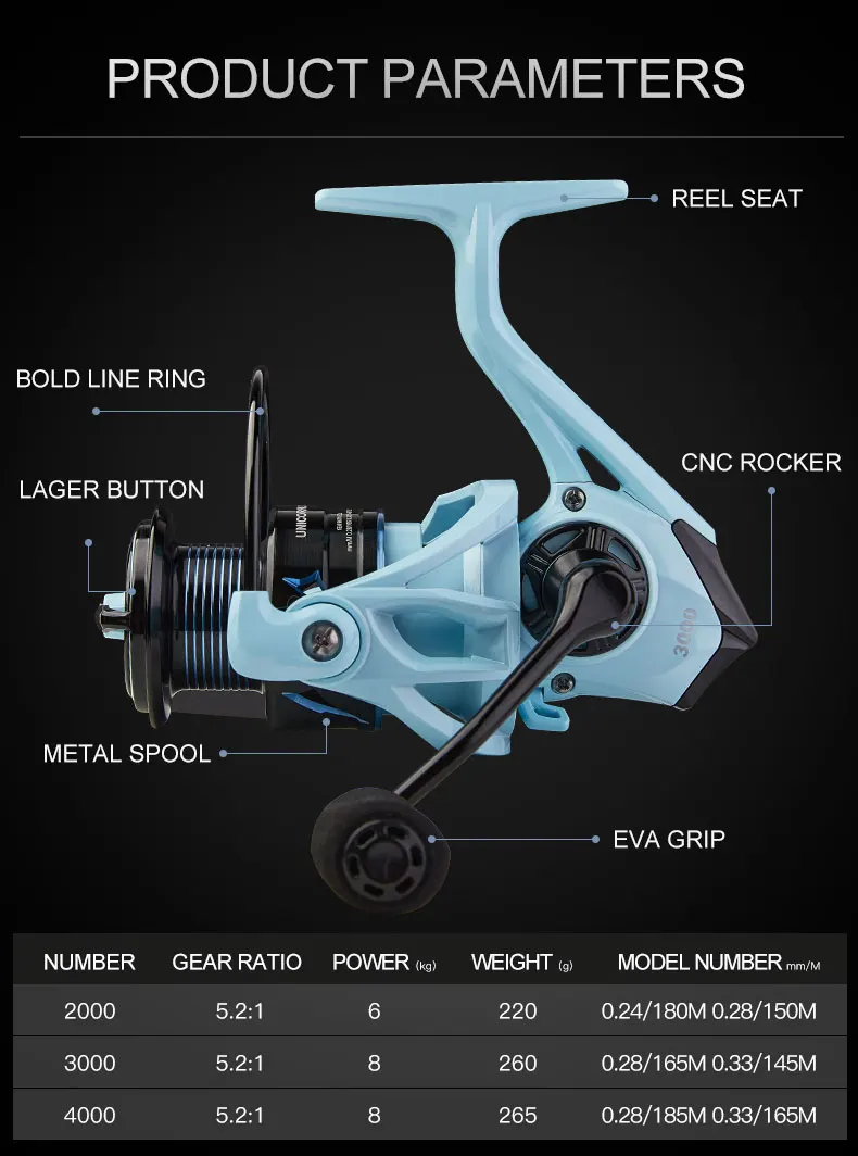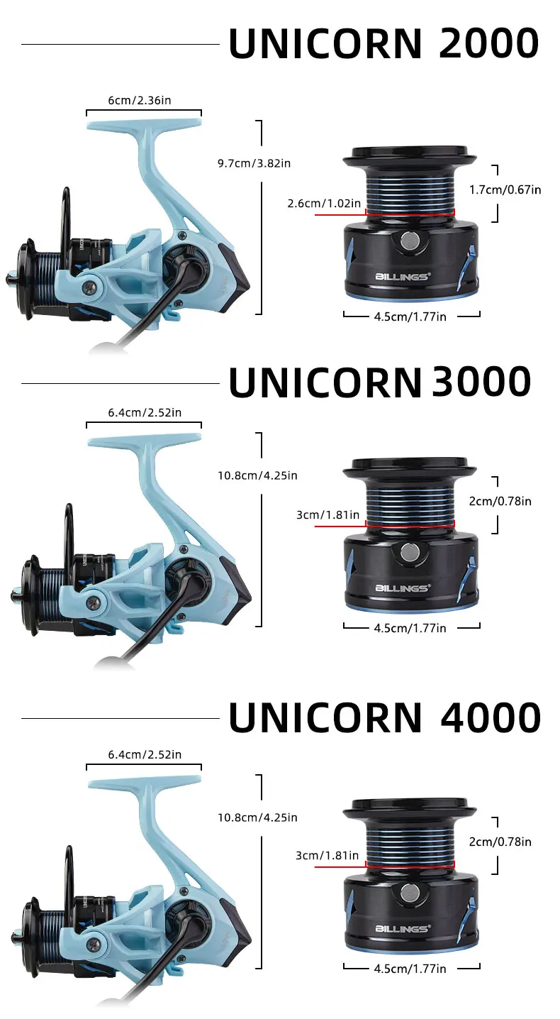 BILLINGS UNICORN Serie 2000-4000, relación de transmisión 5,2: 1, arrastre máximo de 17,6 libras, balancín y carrete de Metal, carrete de pesca giratorio, para agua dulce