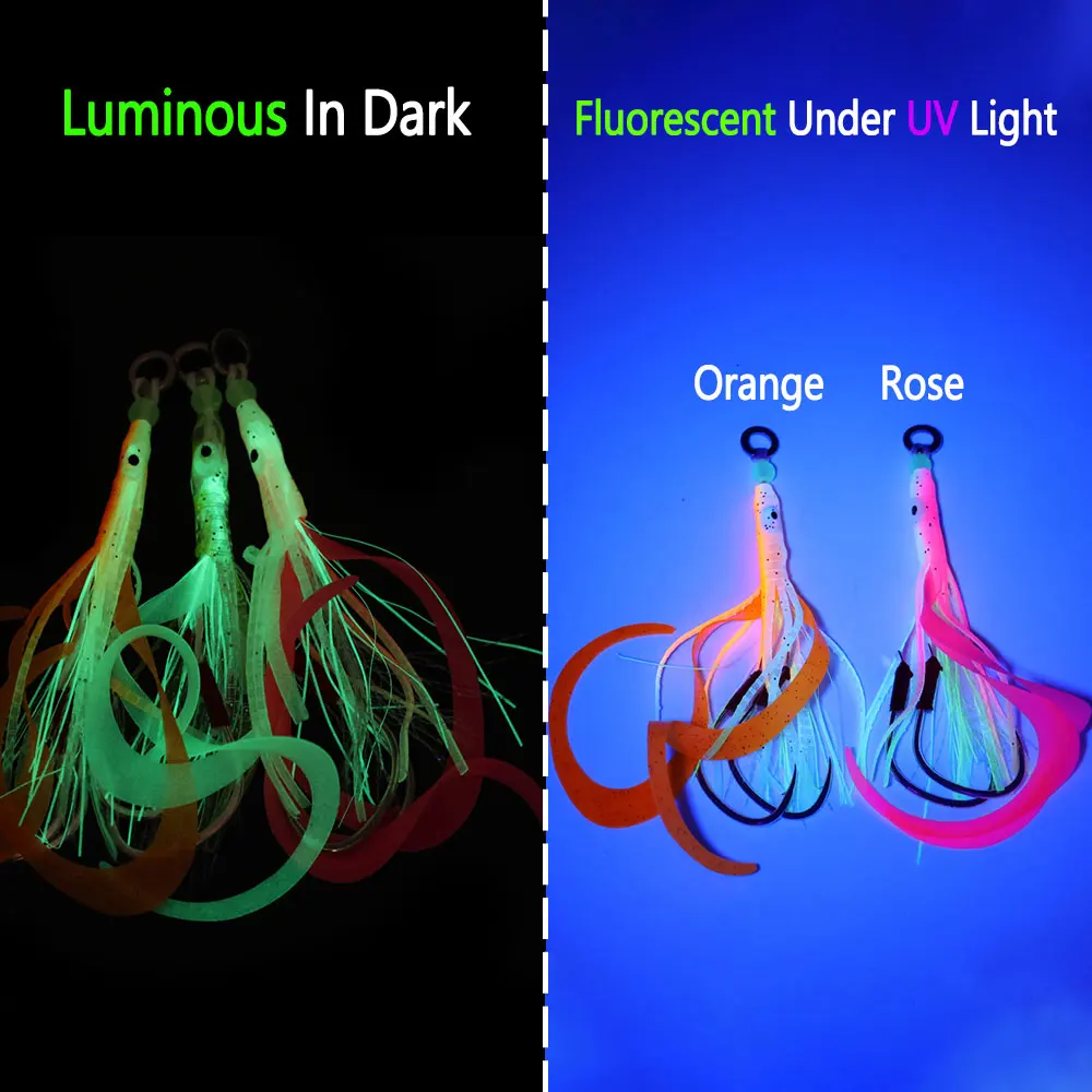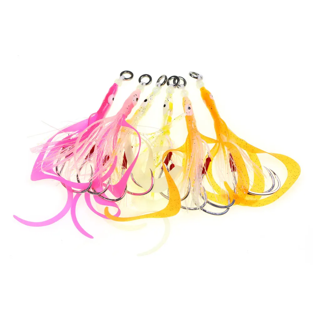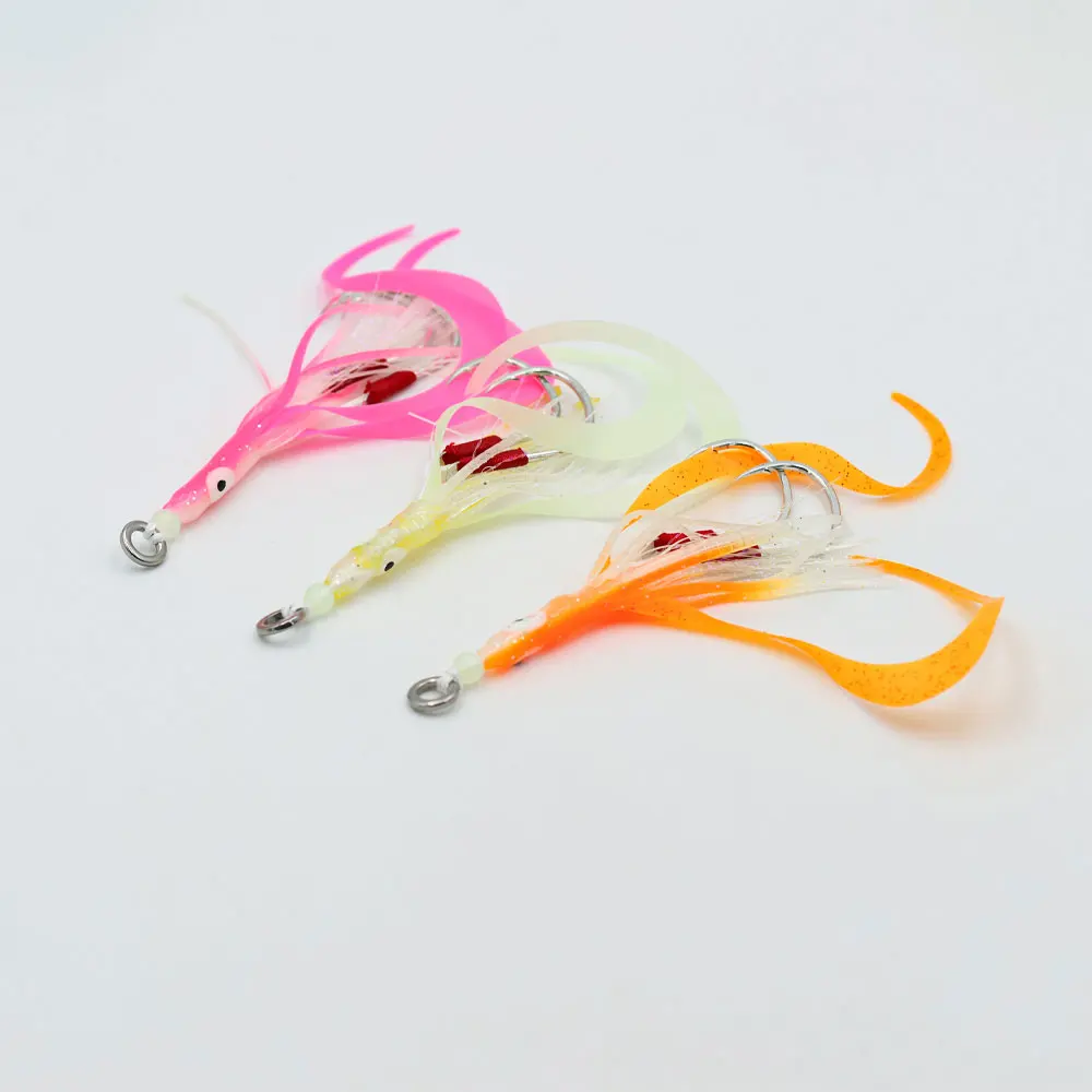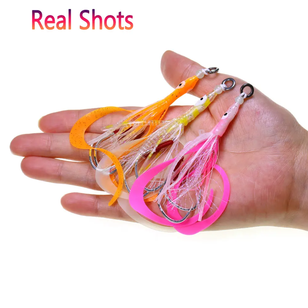 Bimoo 1/3 Uds 3/0 señuelo luminoso de falda de calamar suave con 2 anzuelos de asistencia de jigging lentos cebo de pesca con curricán de pulpo brillante señuelos de pesca de agua salada