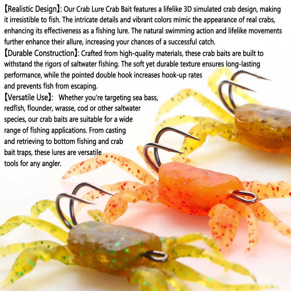 【Construcción duradera】: fabricados con materiales de alta calidad, estos cebos de cangrejo están diseñados para soportar los rigores de la pesca en agua salada.La textura suave pero duradera garantiza un rendimiento duradero, mientras que el anzuelo doble puntiagudo aumenta las tasas de enganche y evita que los peces se escapen.