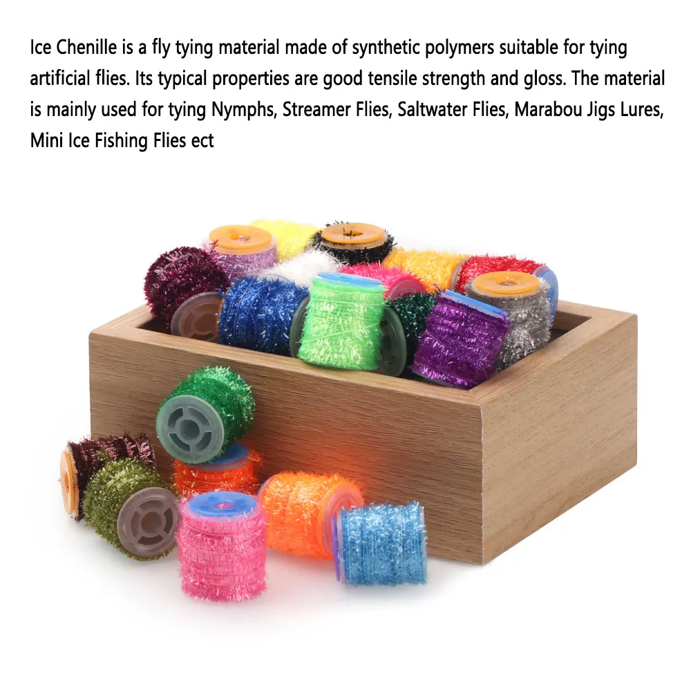 La chenilla de hielo es un material para atar moscas hecho de polímeros sintéticos adecuados para atar moscas artificiales. Sus propiedades típicas son buena resistencia a la tracción y brillo. El material se utiliza principalmente para atar ninfas, moscas Streamer, moscas de agua salada, señuelos Marabou Jigs, Mini moscas de pesca en hielo, etc.