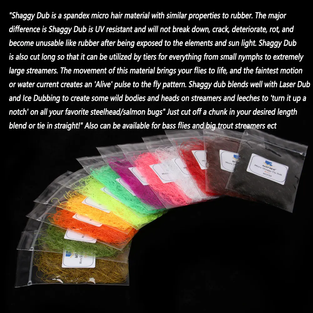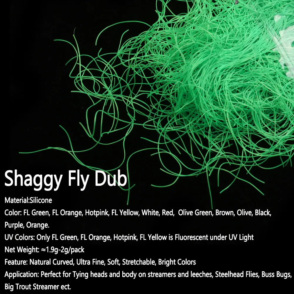 "Shaggy Dub is a spandex micro hair material with similar properties to rubber. The major difference is Shaggy Dub is UV resistant and will not break down, crack, deteriorate, rot, and become unusable like rubber after being exposed to the elements and sun light. Shaggy Dub is also cut long so that it can be utilized by tiers for everything from small nymphs to extremely large streamers. The movement of this material brings your flies to life, and the faintest motion or water current creates an 'Alive' pulse to the fly pattern. Shaggy dub blends well with Laser Dub and Ice Dubbing to create some wild bodies and heads on streamers and leeches to 'turn it up a notch' on all your favorite steelhead/salmon bugs" Just cut off a chunk in your desired length blend or tie in straight!" Also can be available for bass flies and big trout streamers ect