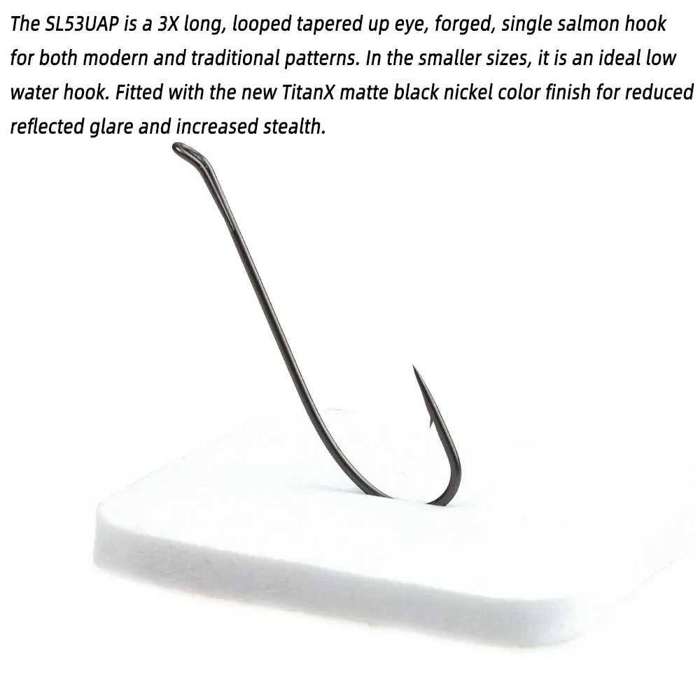 El SL53UAP es un anzuelo de salmón simple forjado con ojo cónico en bucle largo 3X para patrones modernos y tradicionales.En los tamaños más pequeños, es un gancho de agua bajo ideal.Equipado con el nuevo acabado TitanX en color níquel negro mate para reducir el brillo reflejado y aumentar la sigilidad.