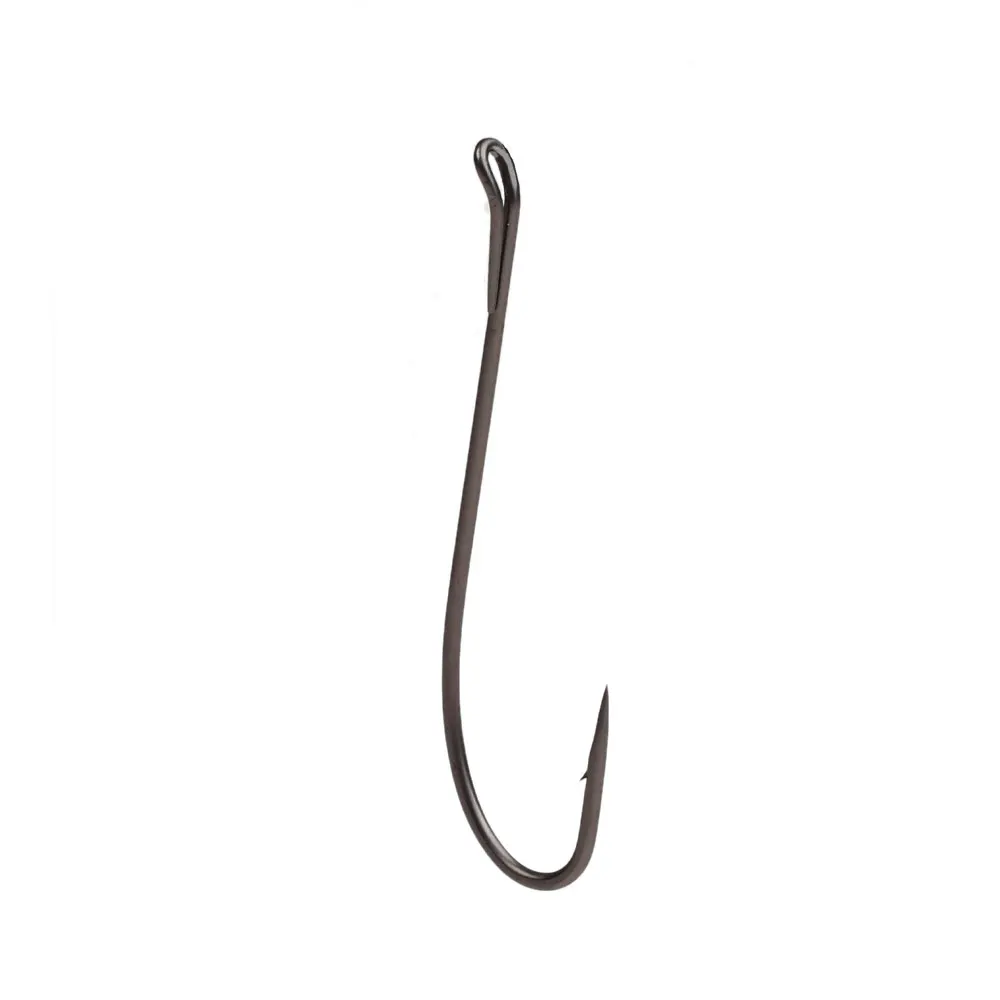 Características del gancho: ojo volteado con bucle cónico, vástago largo 3X, alta resistencia, curvatura única, vástago forjado con punta de aro en línea, punta ultra afilada con púas, acabado en níquel negro mate