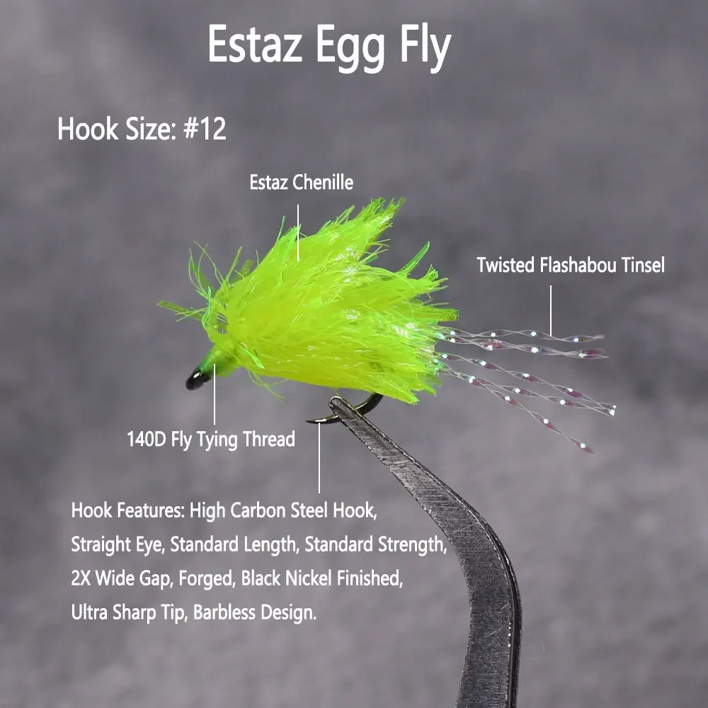The estaz egg is a synthetic fly that imitates trout and salmon. The estaz material sparkles and shines in the water bringing fish in from near and far. All sorts of fish eat eggs but these flies are especially effective for trout and salmon. Both wild fish and stocked fish will hit these flies even when fish are not actually laying eggs.
