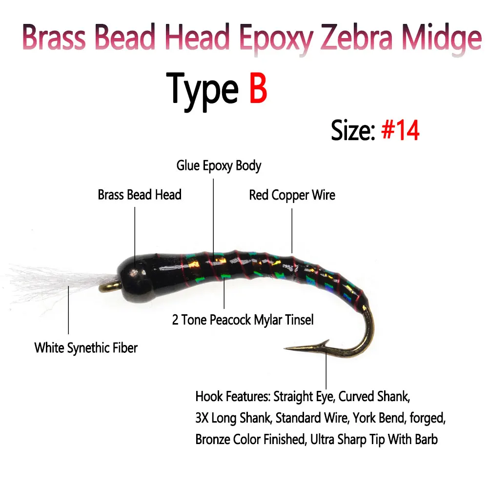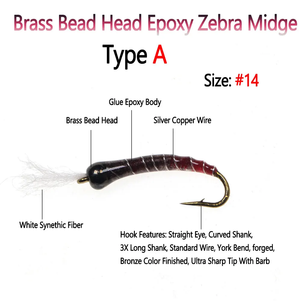 Bimoo 10 piezas#14 cabeza de cuentas de latón epoxi cebra Midge Fly W Barb mosca atado gancho alambre de cobre costilla ninfa mosca truta Señuelos de pesca cebos
